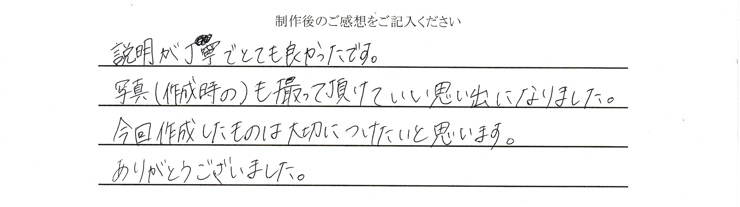 Archiveアーカイブ Home > お客様の声 > 手作りペアリング > 今回作成したものは大切につけたいと思います > IMG_9714 2 IMG_9714 2 トップへ戻る Access アクセス Reserve ご予約