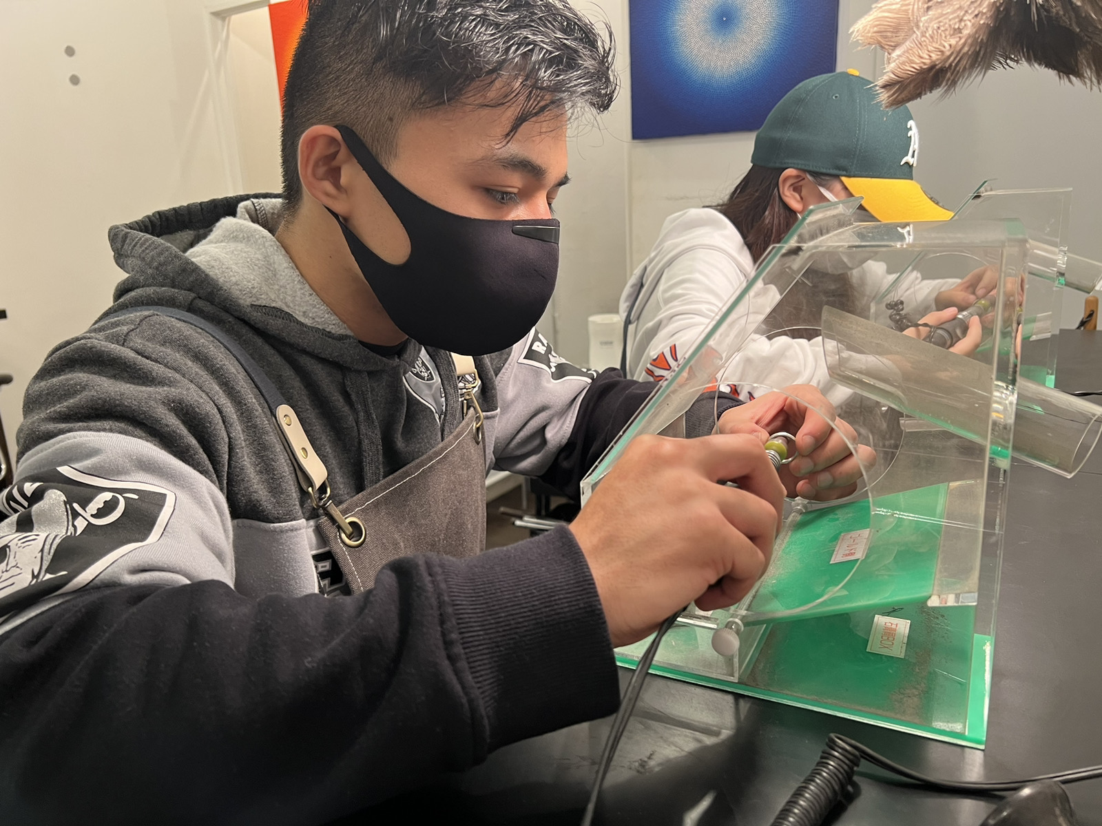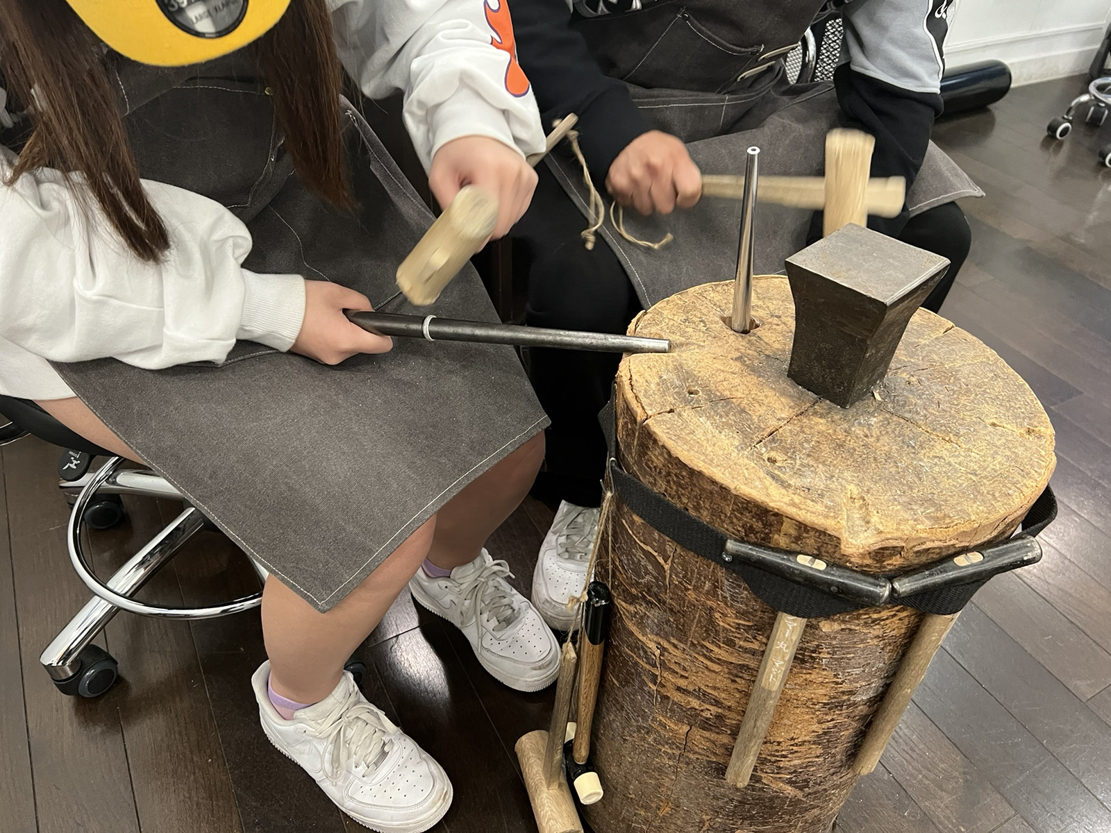 それぞれお相手の指輪を手作りするペアリング制作、素敵です!彼のリング幅が5mmの広めなリングなのでリング形成、研磨が少し大変ですが、一所懸命叩いて磨く彼女とそれを見守る彼が印象的でした。自分達のメッセージを自分達でしっかりリングに刻印して素敵なリングを完成されたました!
