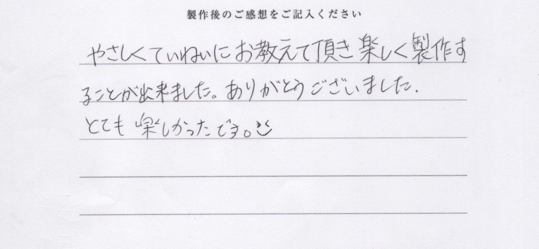 やさしくていねいに教えて頂き楽しく製作することが出来ました。