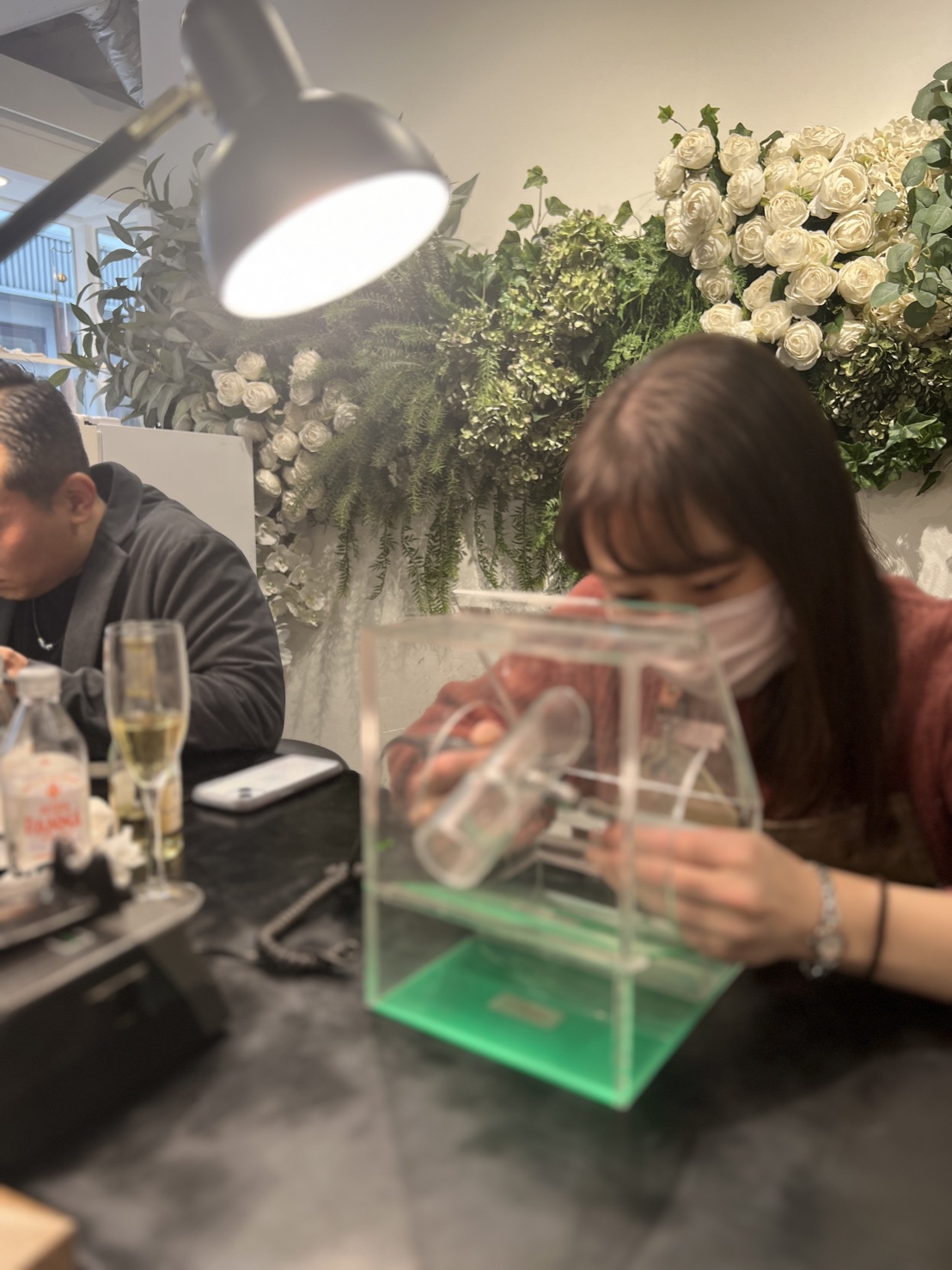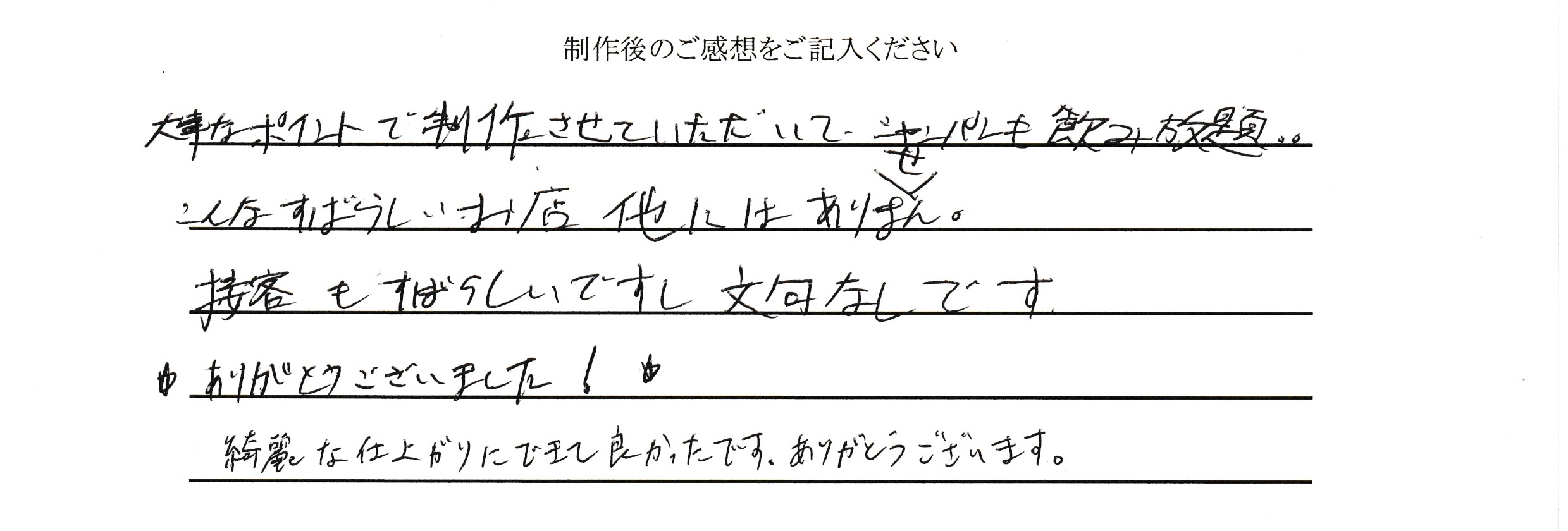 大事なポイントで制作させていただいて、シャンパンも飲み放題。こんなすばらしいお店、他にはありません。接客もすばらしいですし文句なしです。ありがとうございました!綺麗な仕上がりにできて良かったです。ありがとうございます。