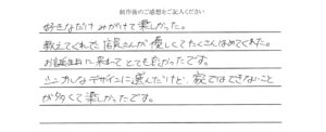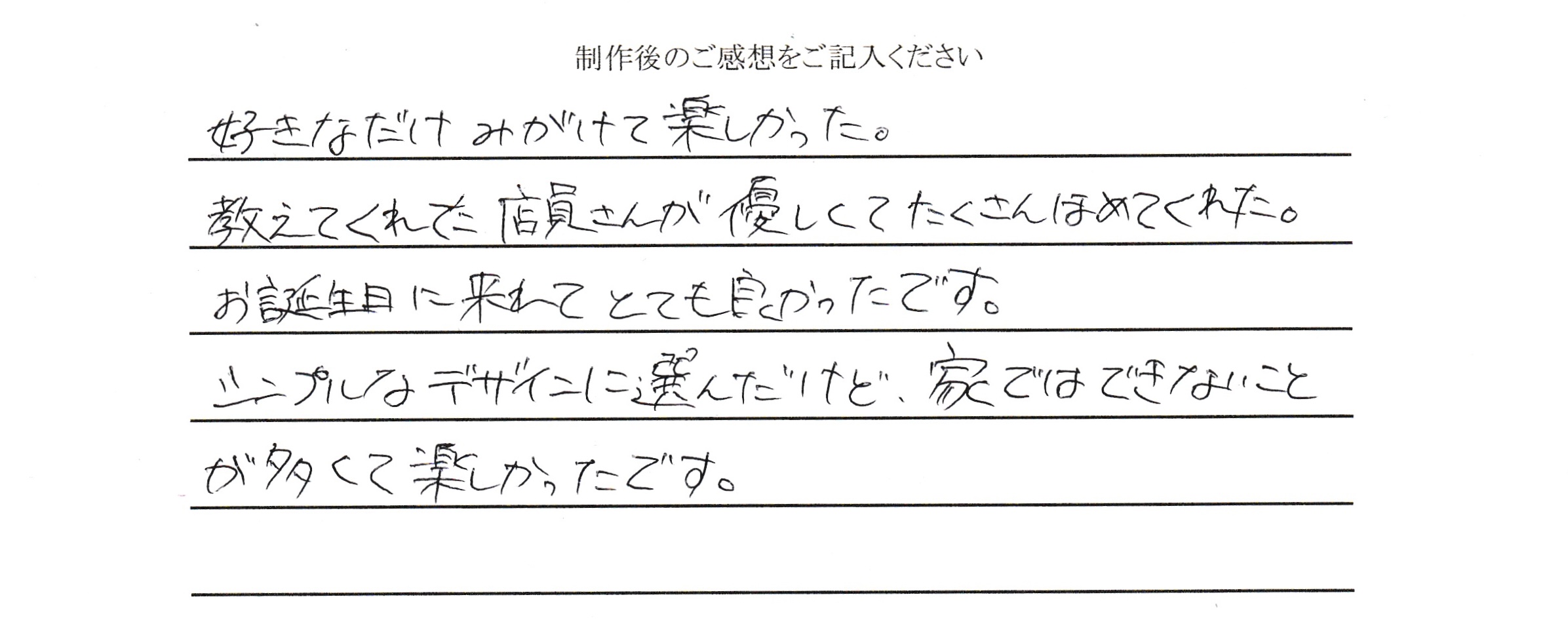 Archiveアーカイブ Home > お客様の声 > 手作りペアリング > 家ではできないことが多くて楽しかったです。 > IMG_1401 IMG_1401 トップへ戻る Access アクセス Reserve ご予約