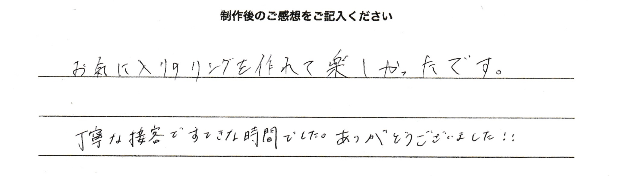 Archiveアーカイブ Home > お客様の声 > 手作りペアリング > お気に入りのリングを制作できて楽しかったです。 > IMG_2660 IMG_2660 #image_title トップへ戻る Access アクセス Reserve ご予約