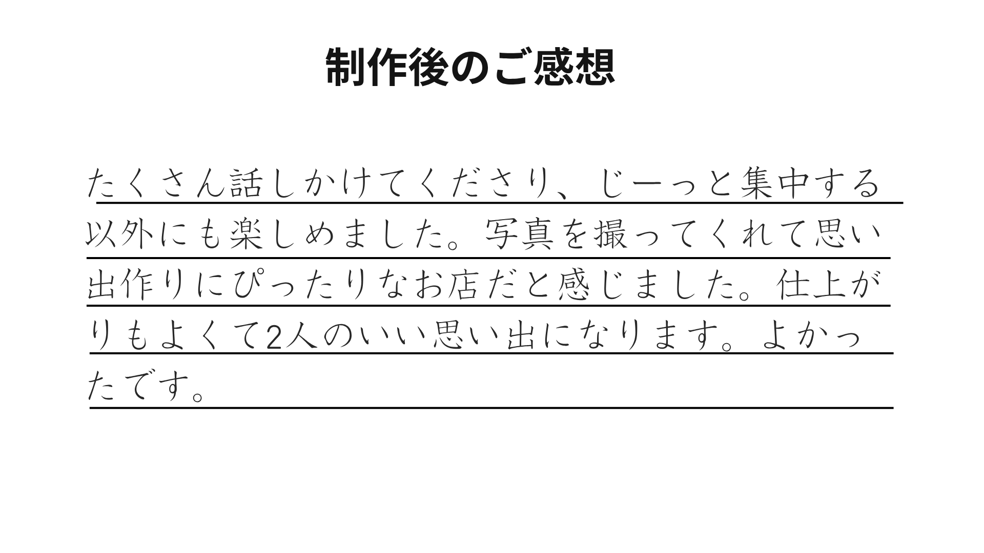 たくさん話しかけてくださり、じーっと集中する以外にも楽しめました。写真を撮ってくれて思い出作りにぴったりなお店だと感じました。仕上がりもよくて2人のいい思い出になります。よかったです。