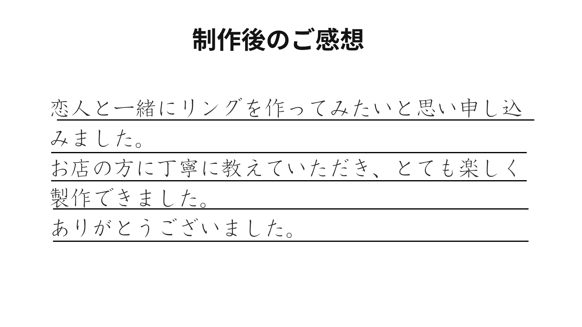 大切な方とご一緒にリング作りをご体験いただき、またスタッフのご案内にご満足いただけたとのお言葉を頂戴し、大変嬉しく存じます。