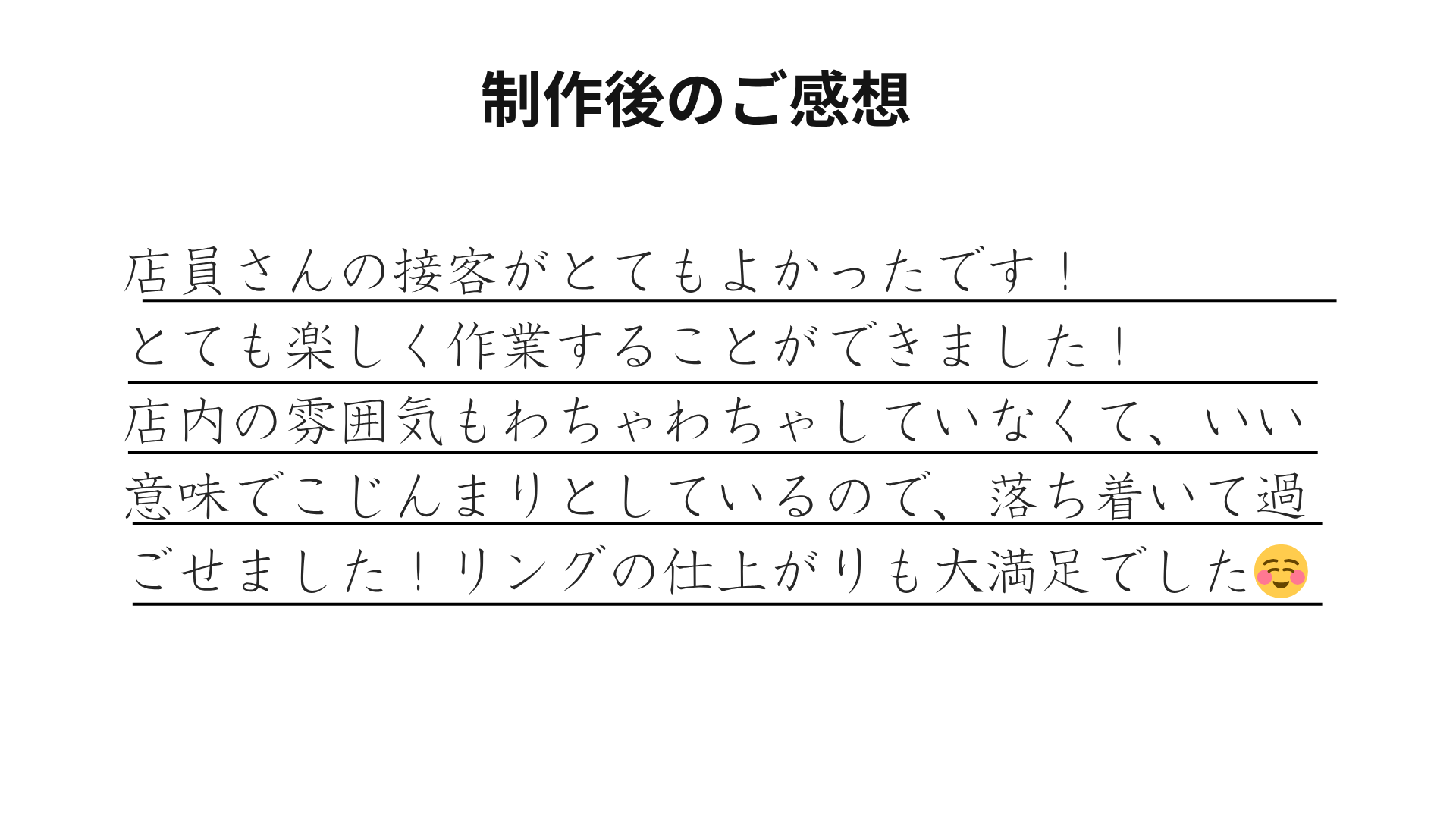 また、落ち着いた店内の雰囲気の中で、楽しく作業に取り組んでいただけたこと、そしてリングの仕上がりにもご満足いただけたとのこと、心より光栄に思っております。