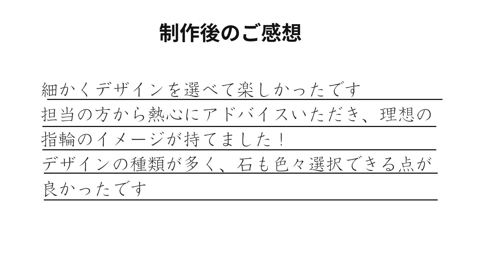 細部までデザインをお選びいただきながら制作をお楽しみいただけたこと、また担当スタッフの熱心なアドバイスにより理想の指輪のイメージを明確にしていただけたとのお言葉、大変嬉しく存じます。
