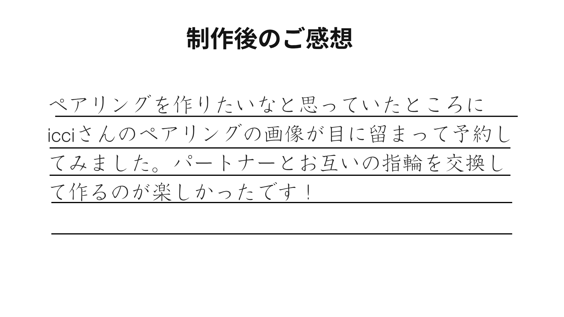 パートナー様とお互いの指輪を交換して作るという特別な体験をお楽しみいただけたとのお言葉は、私どもにとっても嬉しい限りでございます。