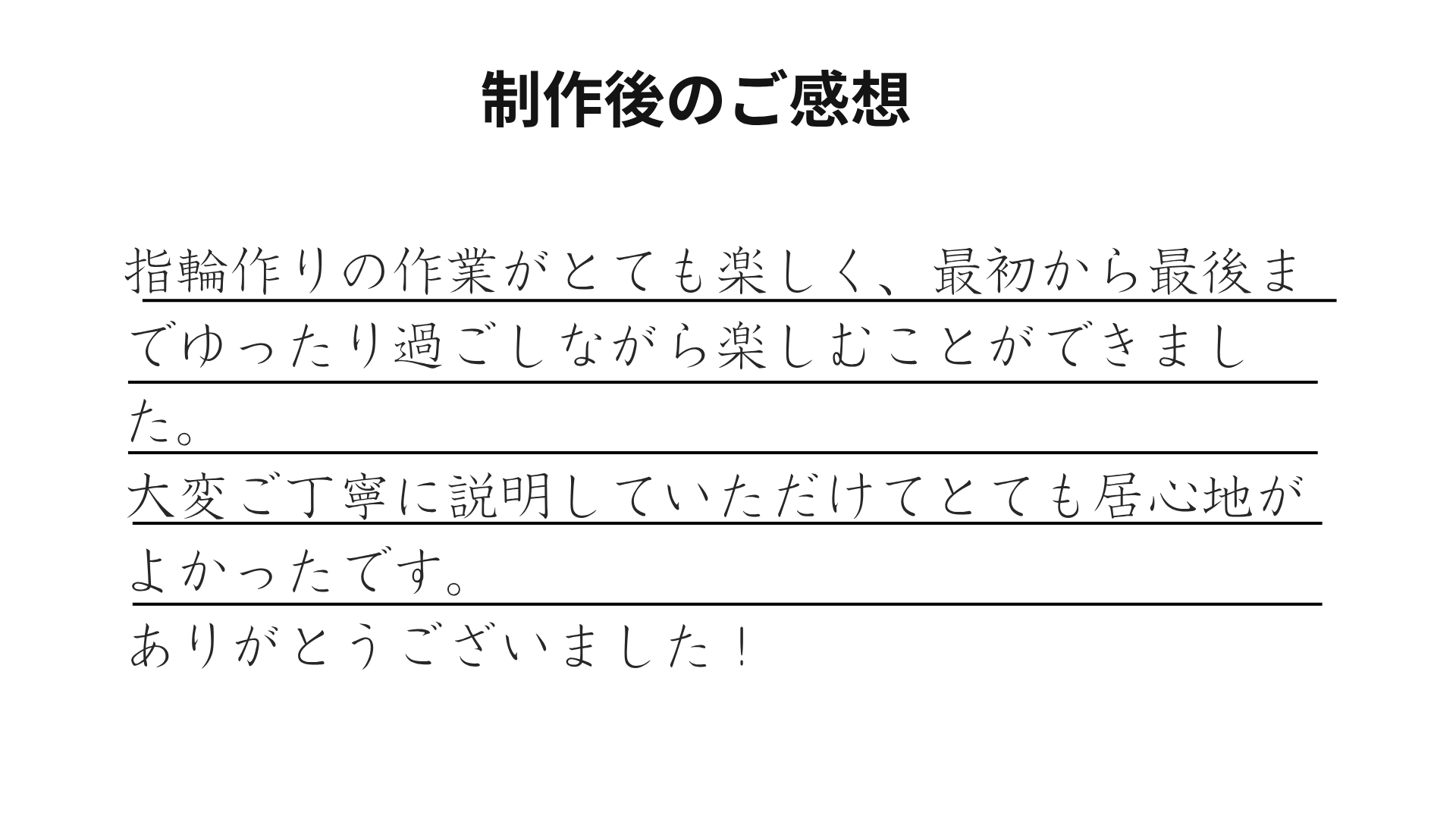 "指輪作りの作業がとても楽しく、最初から最後までゆったり過ごしながら楽しむことができました。