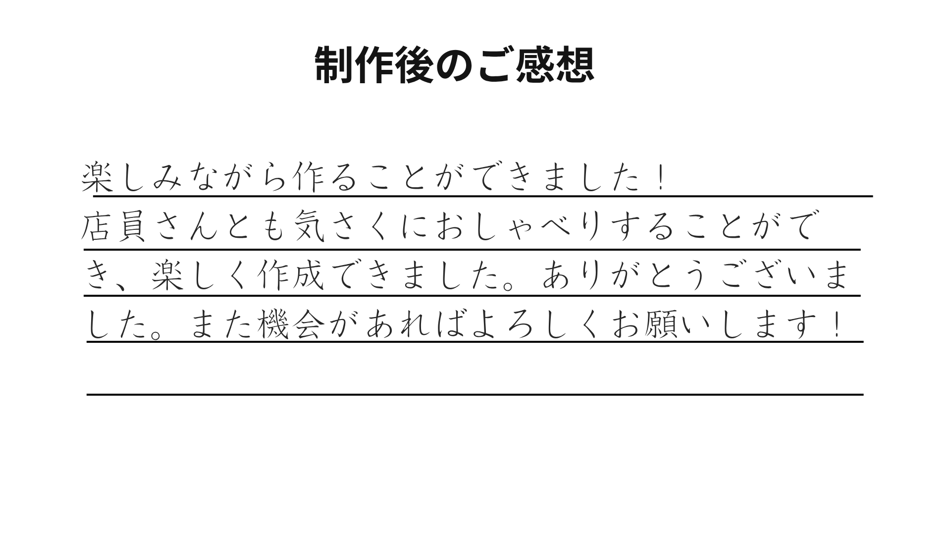 店員さんとも気さくにおしゃべりすることができ、楽しく作成できました。ありがとうございました。また機会があればよろしくお願いします!