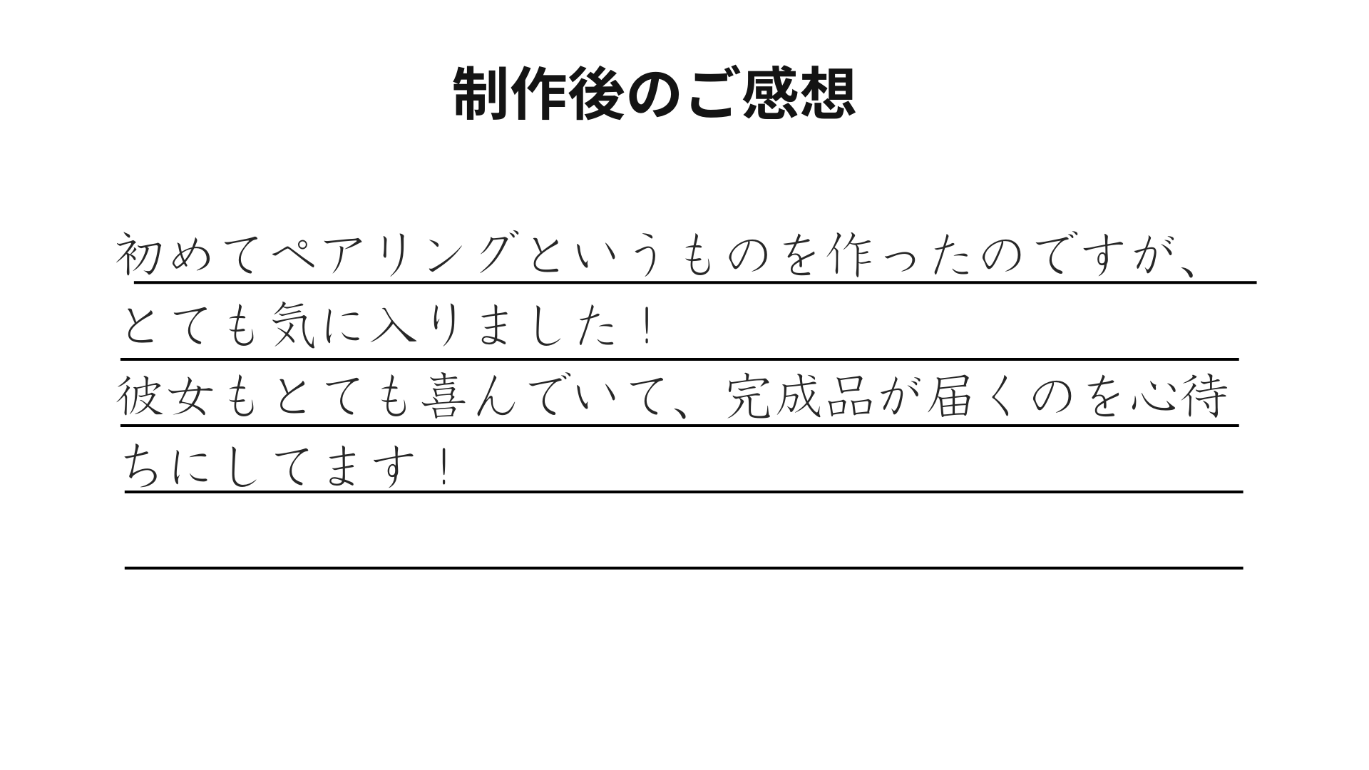 お作りいただいたペアリングをお気に召していただけたこと、また彼女様にも喜んでいただけたとのお言葉を、大変嬉しく拝見いたしました。