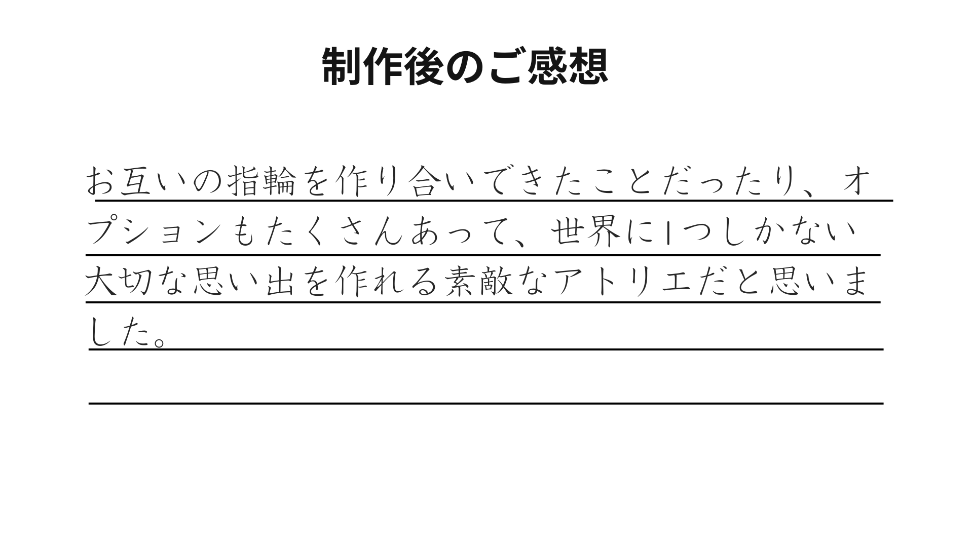 お互いの指輪を作り合うという特別な体験をお楽しみいただけたこと、また豊富なオプションを通じて「世界にひとつだけのリング」をデザインいただけたとのお言葉、大変嬉しく存じます。
