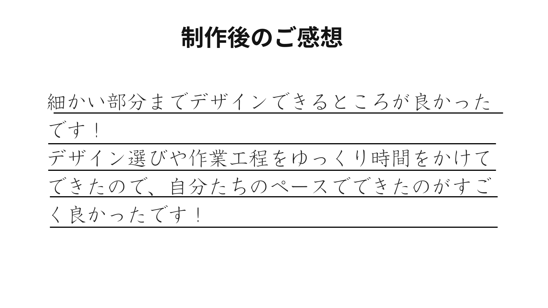 細部までこだわってデザインできる点を評価していただき、また、デザイン選びや作業工程をゆったりとご自身のペースで楽しんでいただけたとのこと、大変嬉しく存じます。