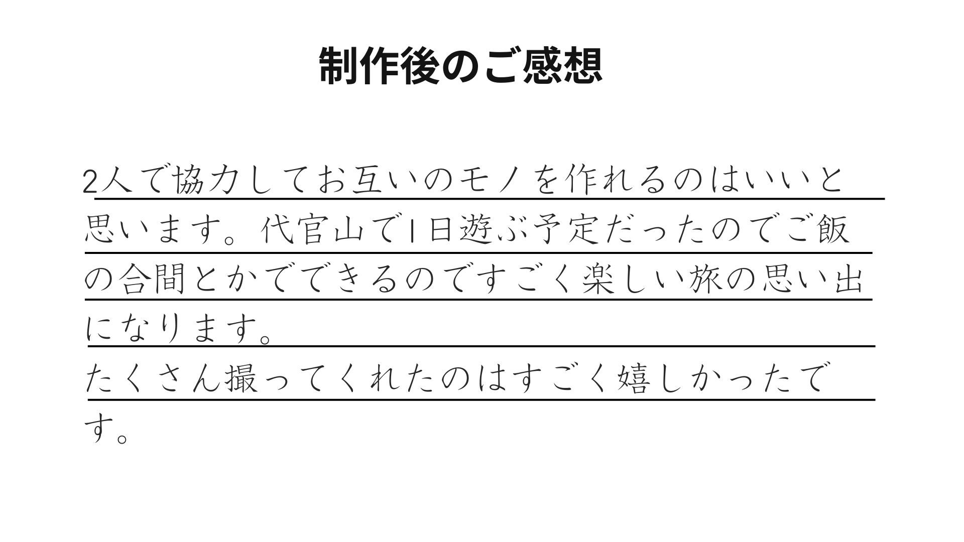 2人で協力してお互いのモノを作れるのはいいと思います。代官山で1日遊ぶ予定だったのでご飯の合間とかでできるのですごく楽しい旅の思い出になります。
