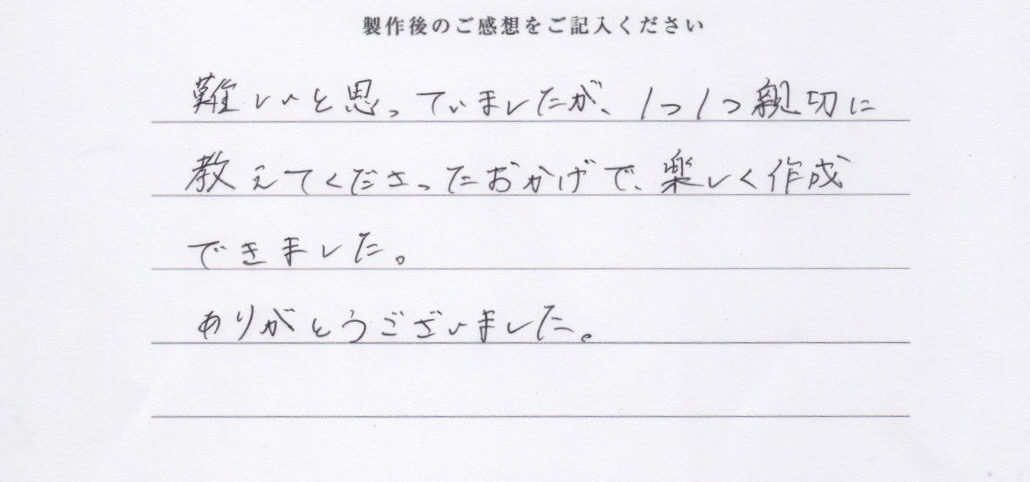 1つ1つ親切に教えてくださったおかげで、 楽しく作成できました。