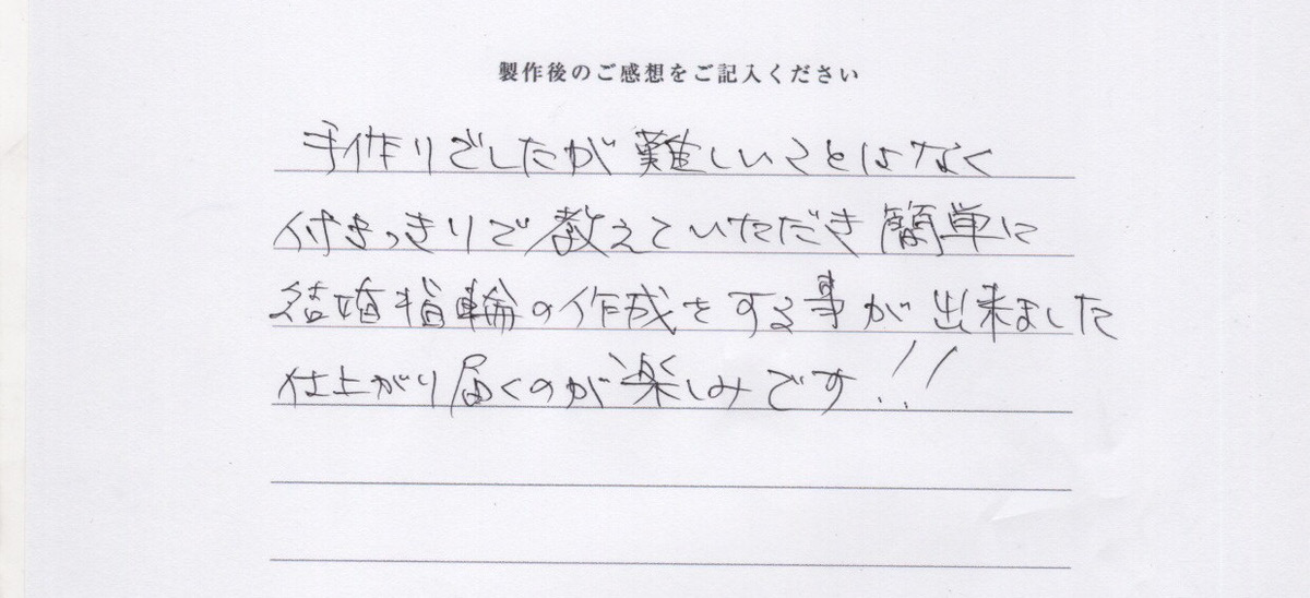付きっきりで教えて頂き簡単に結婚指輪を作成する事ができました。