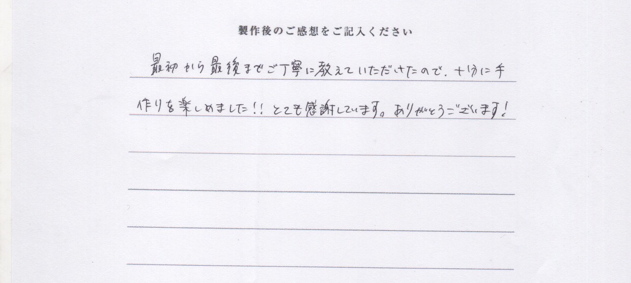最初から最後までご丁寧に教えていただいたので十分に手作りを楽しめました。