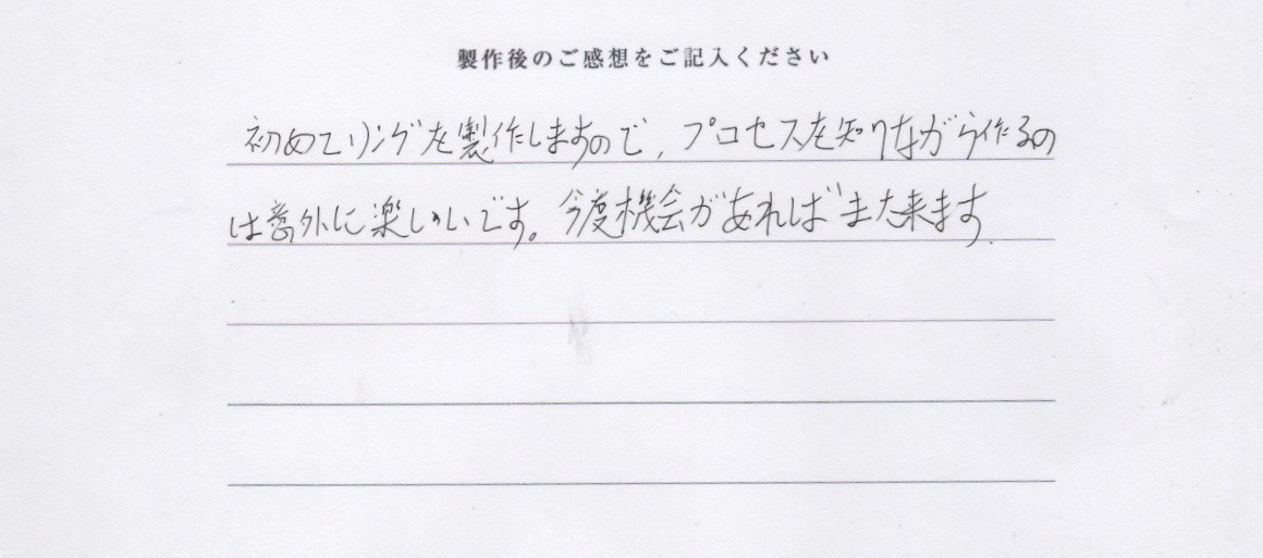初めてリングを制作するのでプロセスを知りながら作るのが意外に楽しかったです。