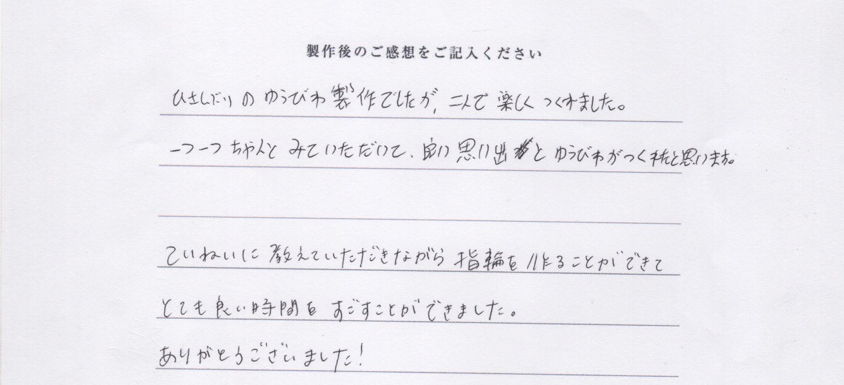 久しぶりの指輪制作でしたが二人で楽しく作れました。