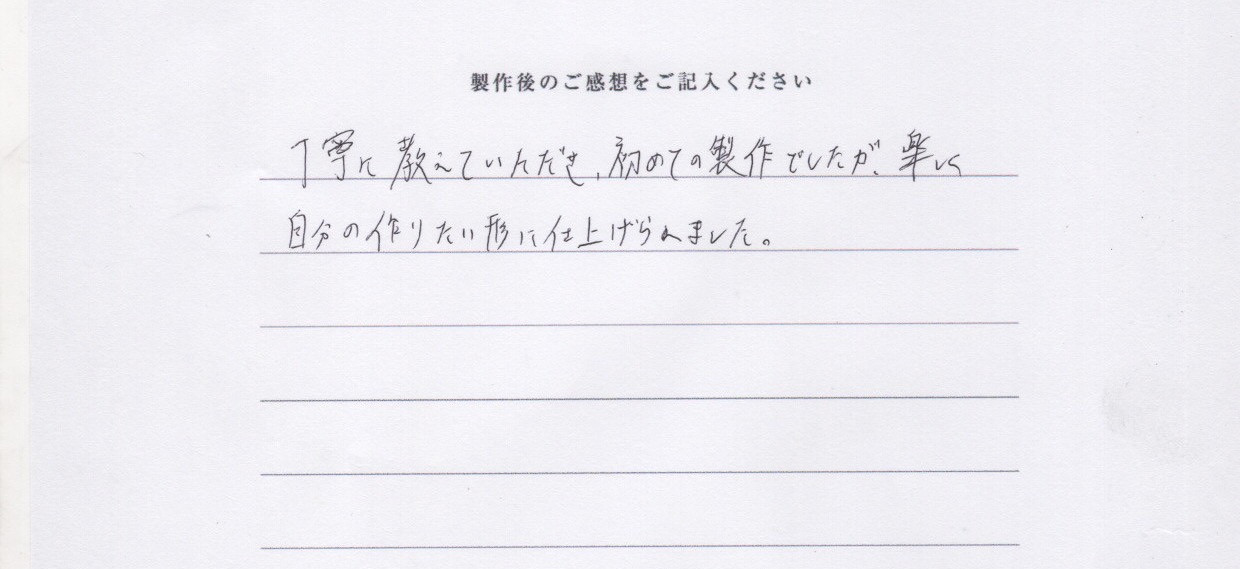 丁寧に教えて頂き初めての制作でしたが楽しく自分の作りたい形に仕上げられました。