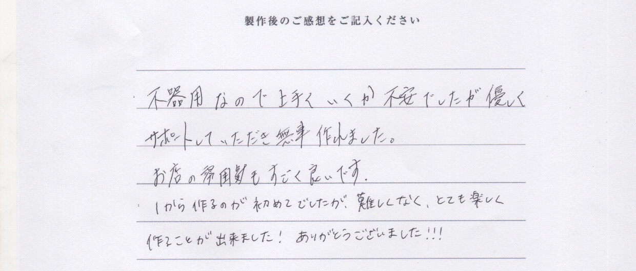 不器用なので上手くいくか不安でしたが優しくサポート頂き無事作れました。