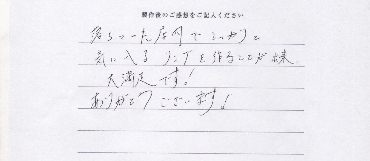 落ち着いた店内でしっかりと気にいるリングを作る事ができ大満足です!ありがとうございます!