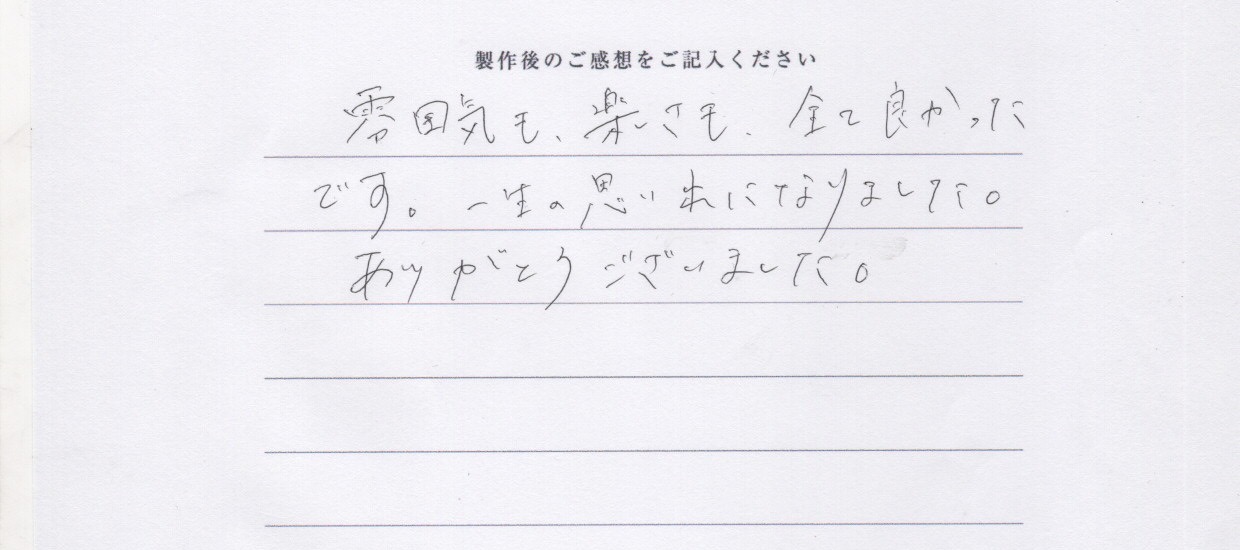 雰囲気も楽しさも全て良かったです。 一生の思い出になりました。