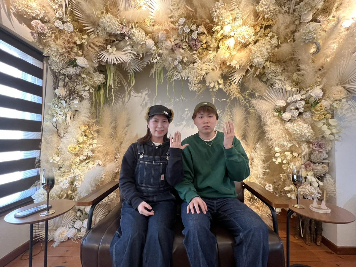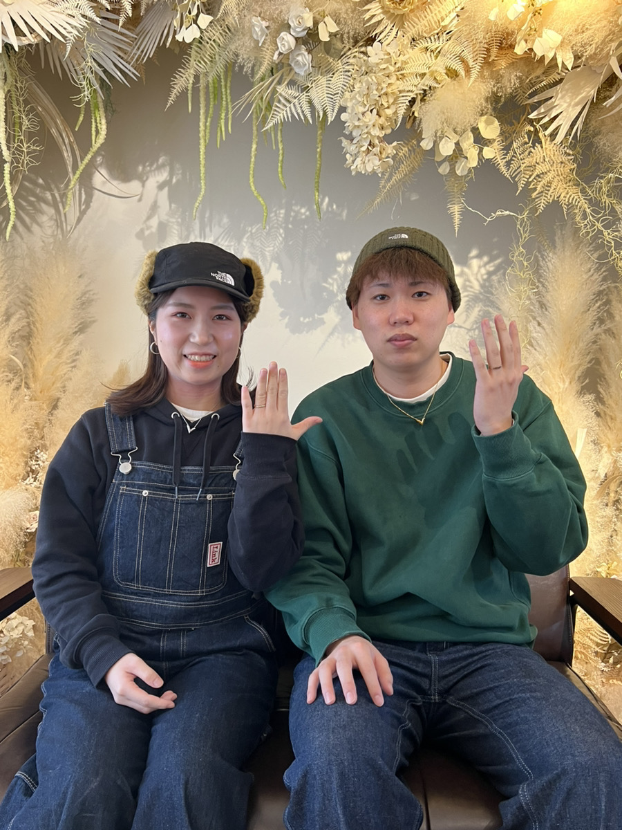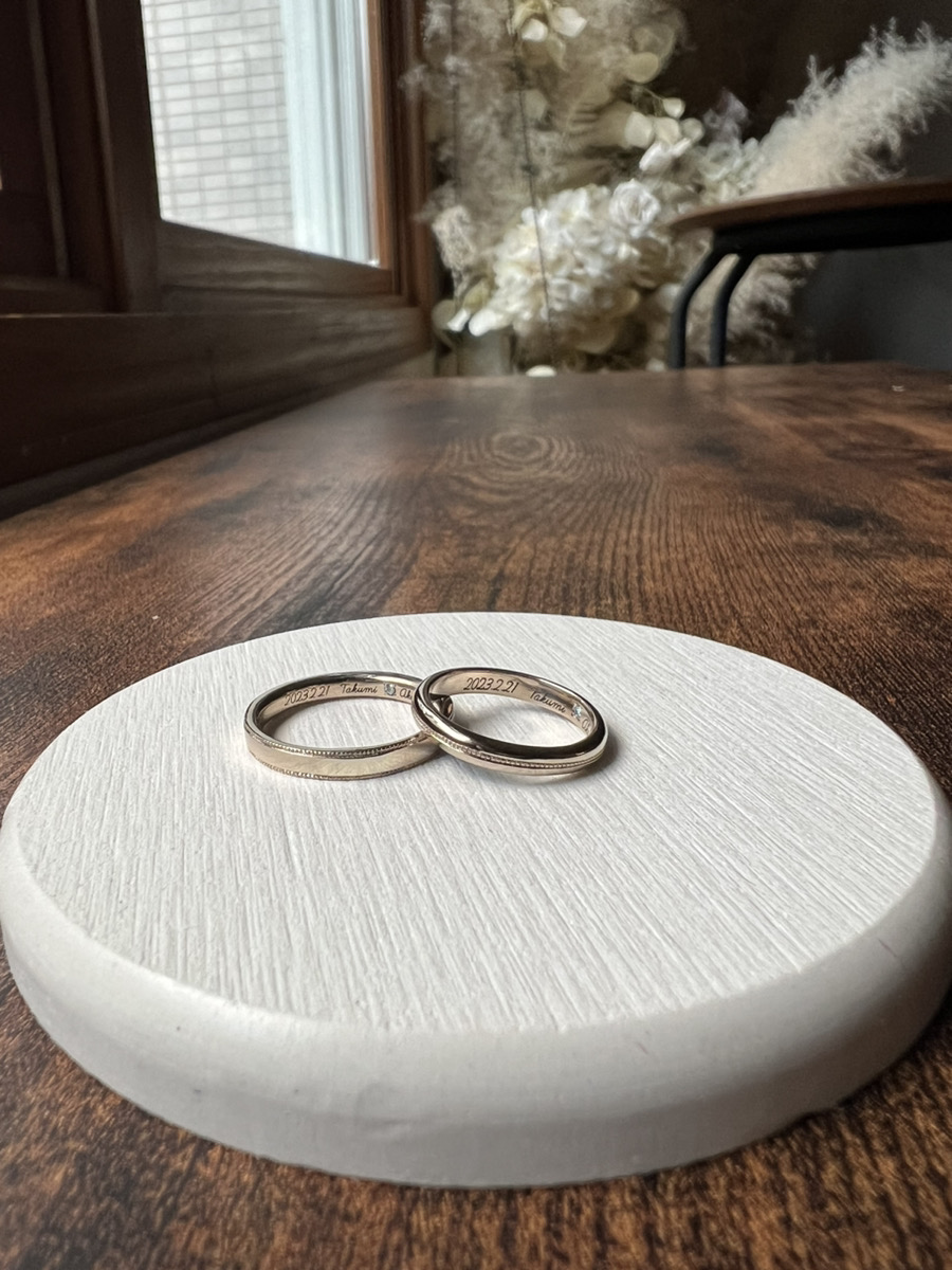 お二人の結婚指輪のデザインはミル打ちを施したシャンパンゴールドのゴージャス感がありながらも落ち着いた印象を持つリング。
