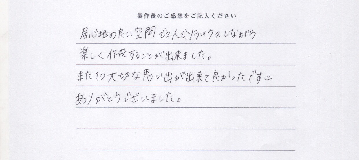 居心地の良い空間で2人で、リラックスしながら楽しく作成することが出来ました。 また1つ大切な思い出が出来て良かったです。