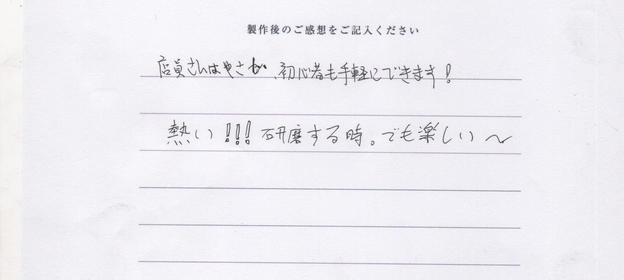 店員さんは優しい。 初心者も手軽にできます。 熱い!!研磨する時。 でも楽しい
