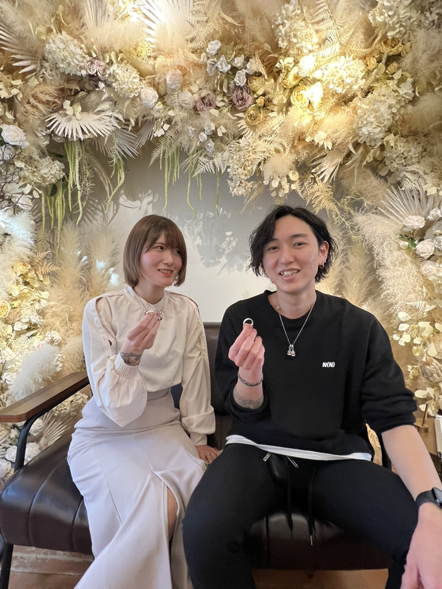 スタイリッシュなお二人が選んだデザインは存在感ある太めのリングに輝きあるスターダスト仕上げ。