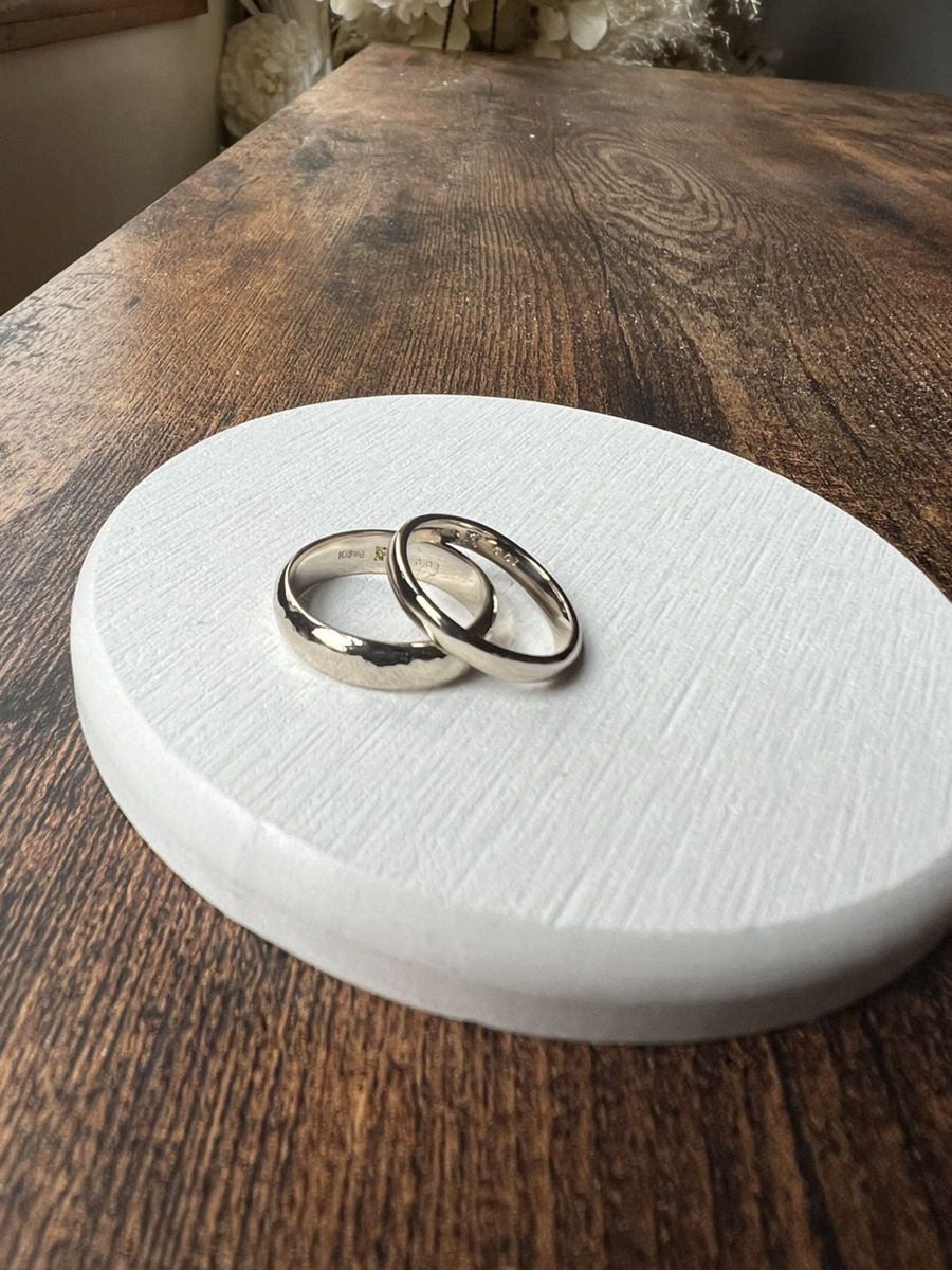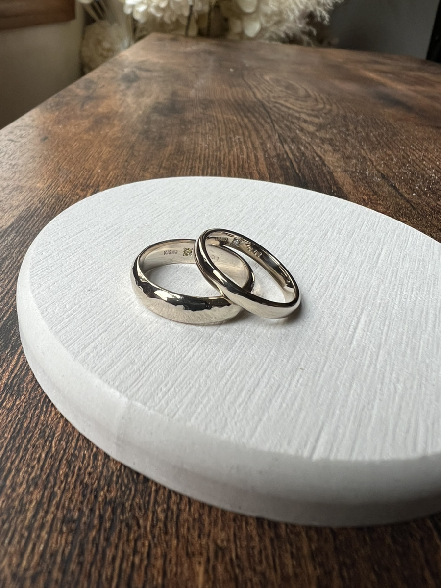 シャンパンゴールドのハンマー仕上げと鏡面仕上げの結婚指輪がとてもお似合いでした!