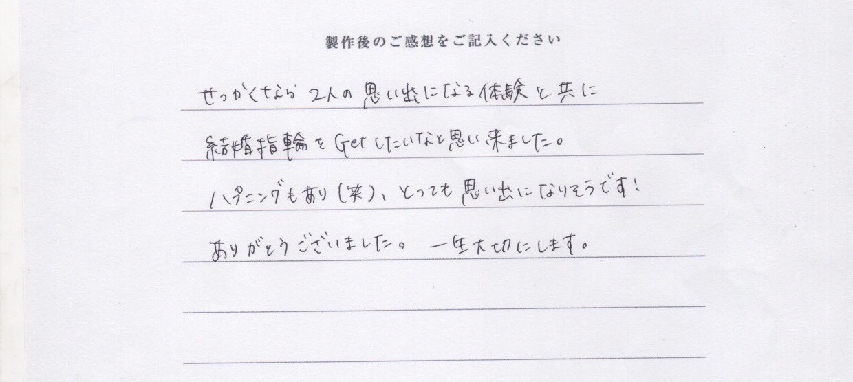 せっかくなら2人の思い出になる体験と共に結婚指輪をGETしたいなと思い来ました。