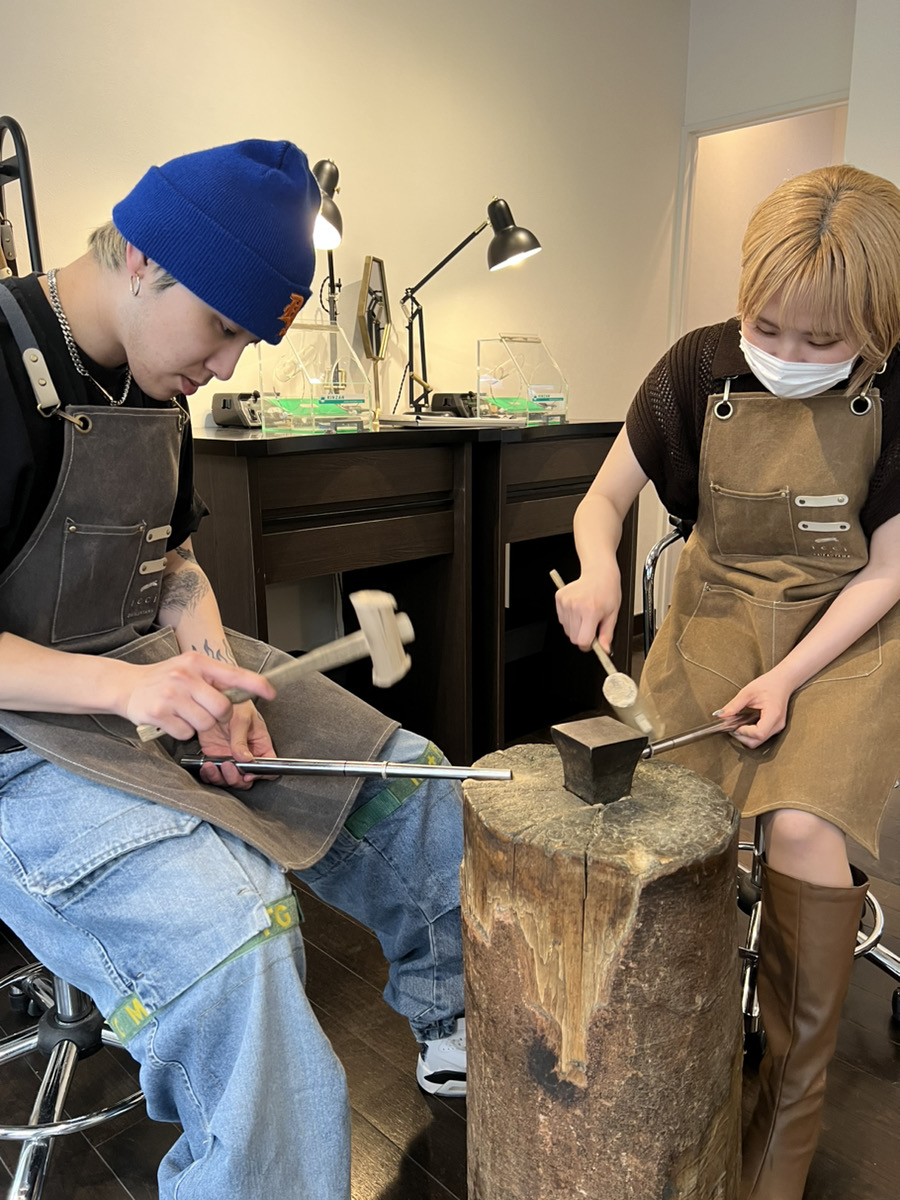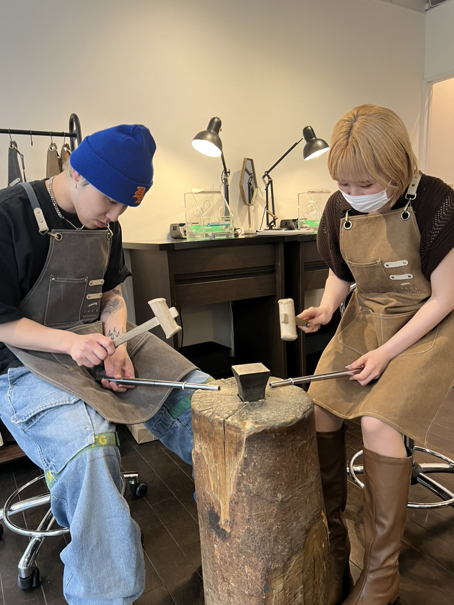 太めのリングなので木槌叩きは少し大変ですが彼のサポートで上手に仕上がりました。