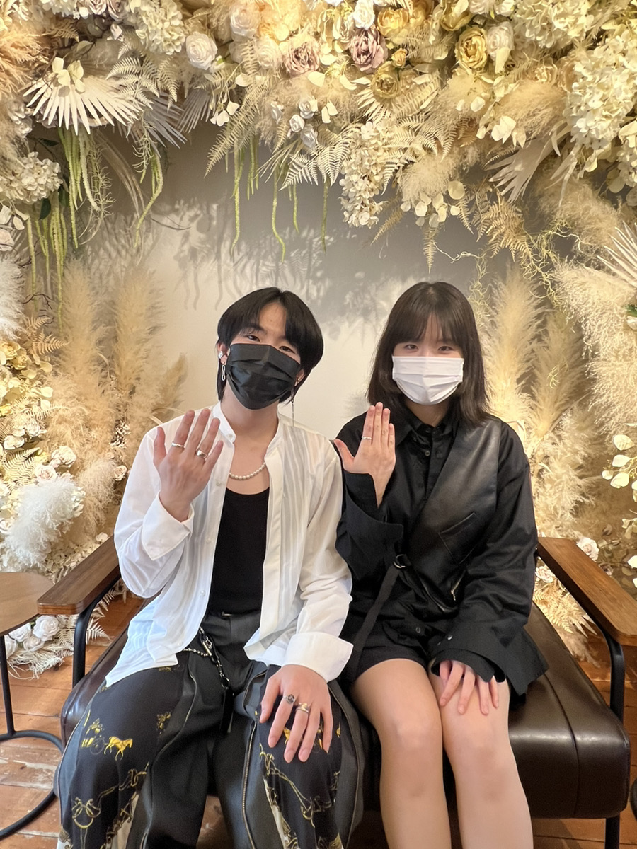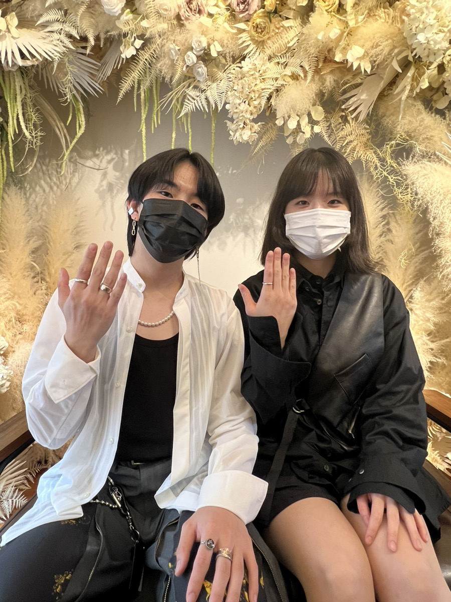 ファッション好きな印象のお二人が選んだペアリングデザインはハンマー仕上げの極太リング。