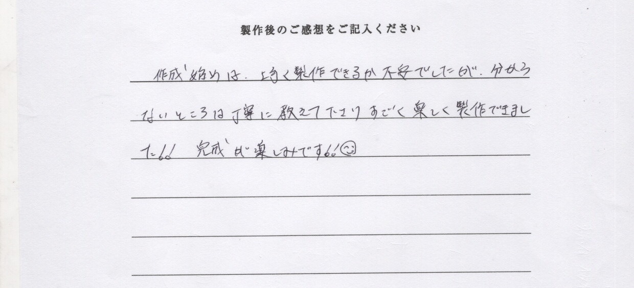 分からないところは丁寧に教えてくださりすごく楽しく制作出来ました!! 完成が楽しみです!!