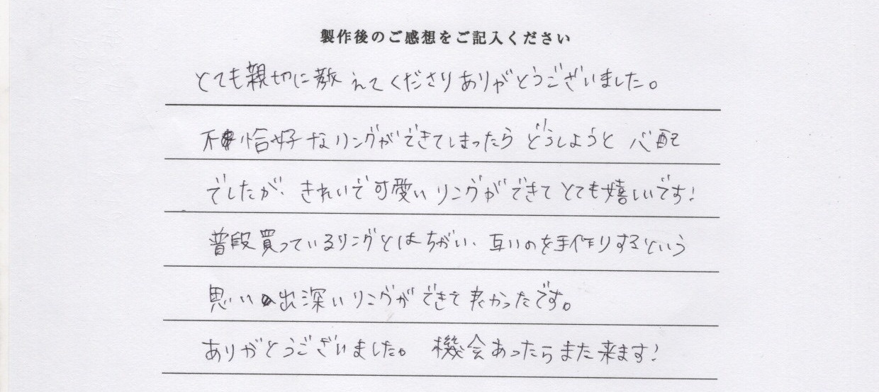 普段買っているリングと違い、互いのを手作りするという思い出深いリングができてよかったです。