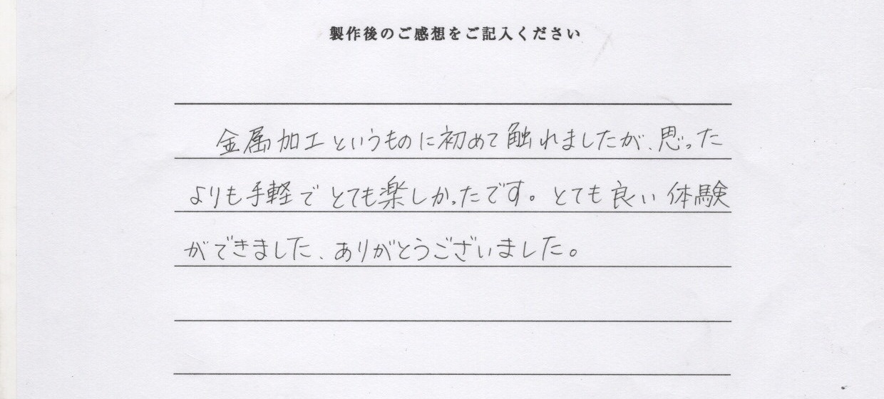 金属加工というものに初めて触れましたが思ったより手軽でとても楽しかったです。