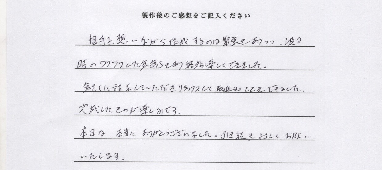 気さくに話をして頂きリラックスして取り組む事が出来ました。完成した物が楽しみです。