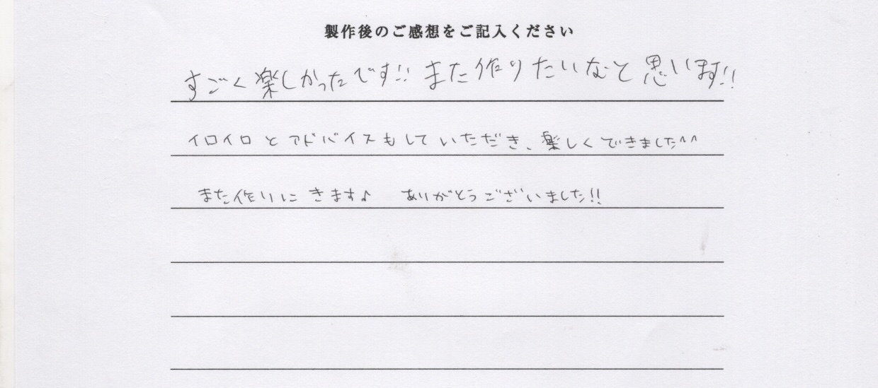 すごく楽しかったです!また作りたいなと思います! いろいろとアドバイスも頂き楽しくできました。 また作りに来ます。