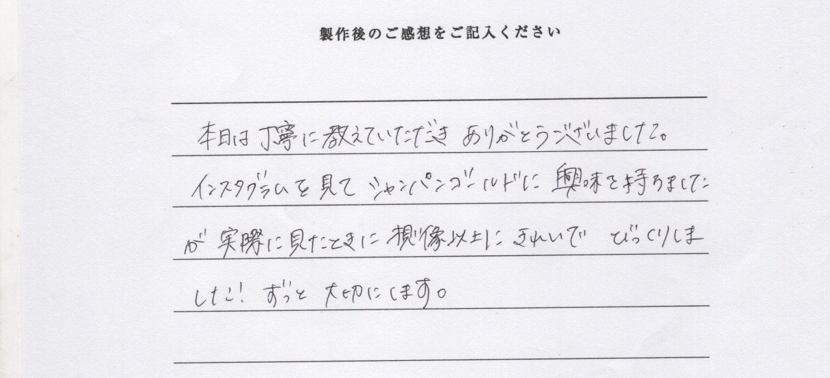 素材も実物を見たらプラチナよりシャンパンゴールドを気に入られ結婚指輪制作頂きました。