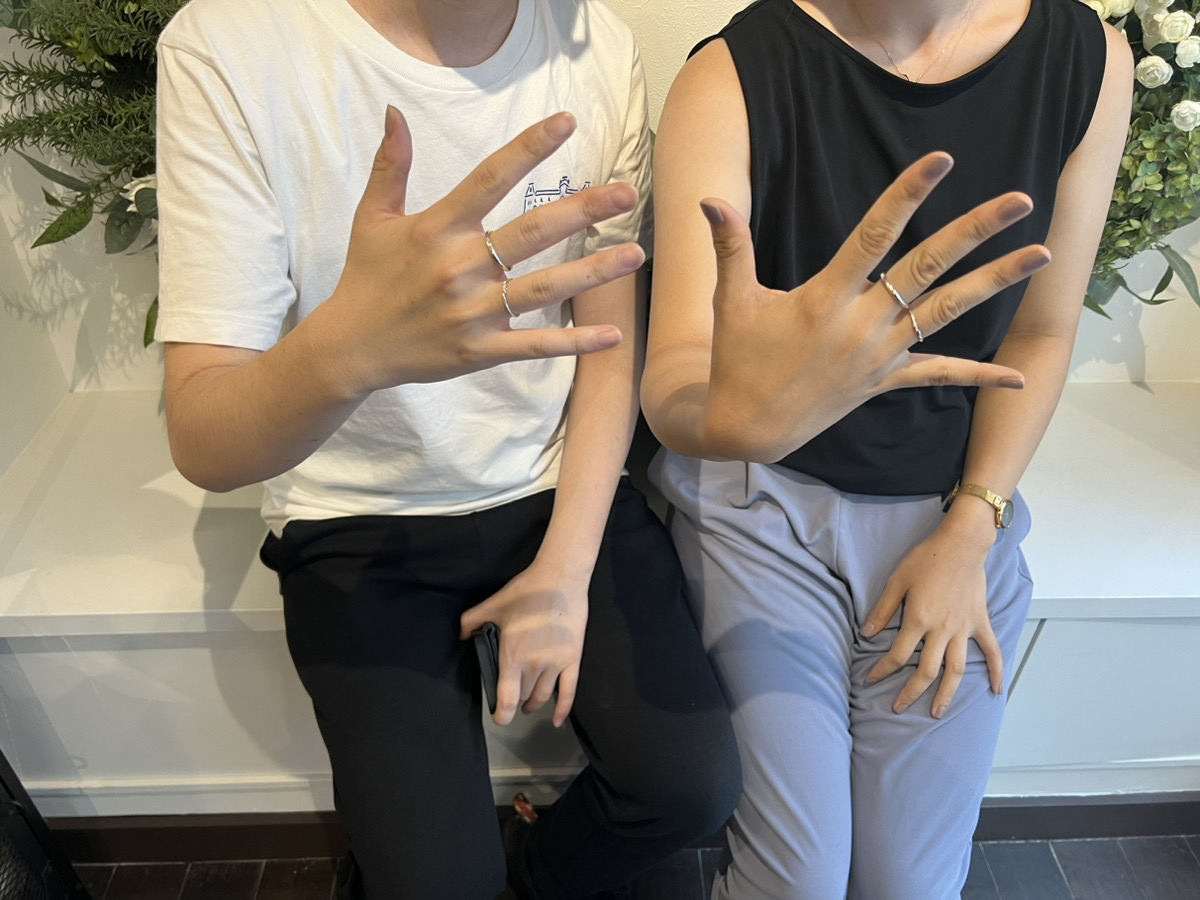 雰囲気のあるオシャレなお二人が選んだペアリングは極細のリングのハンマー仕上げ。