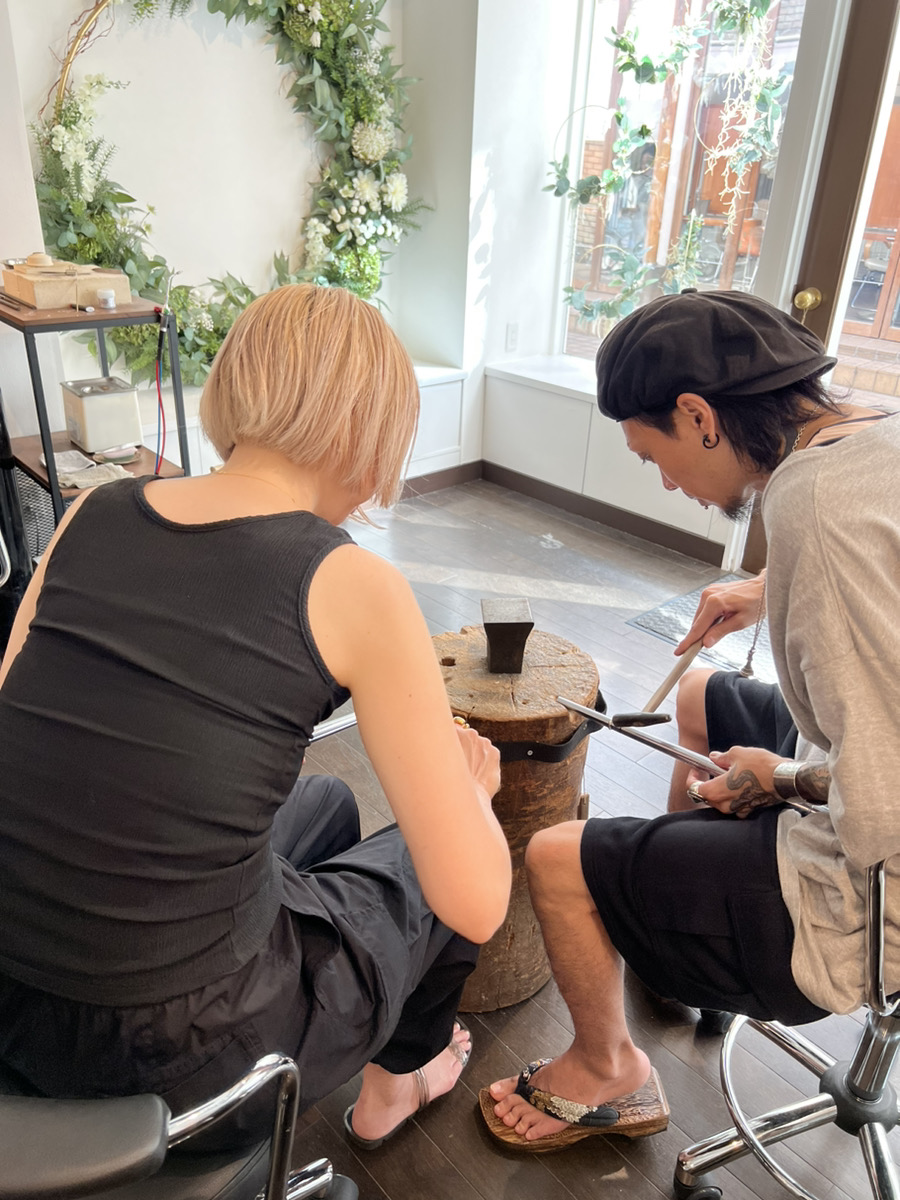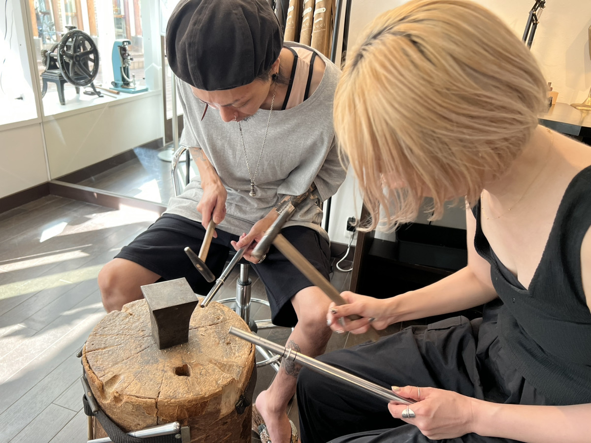 お二人おそろいのハンマー仕上げペアリングを制作。