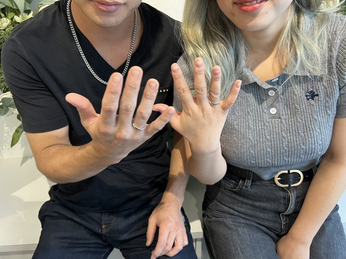 お二人の選んだペアリングデザインはシャープな印象を持つスクエア平打ち鏡面仕上げリング。