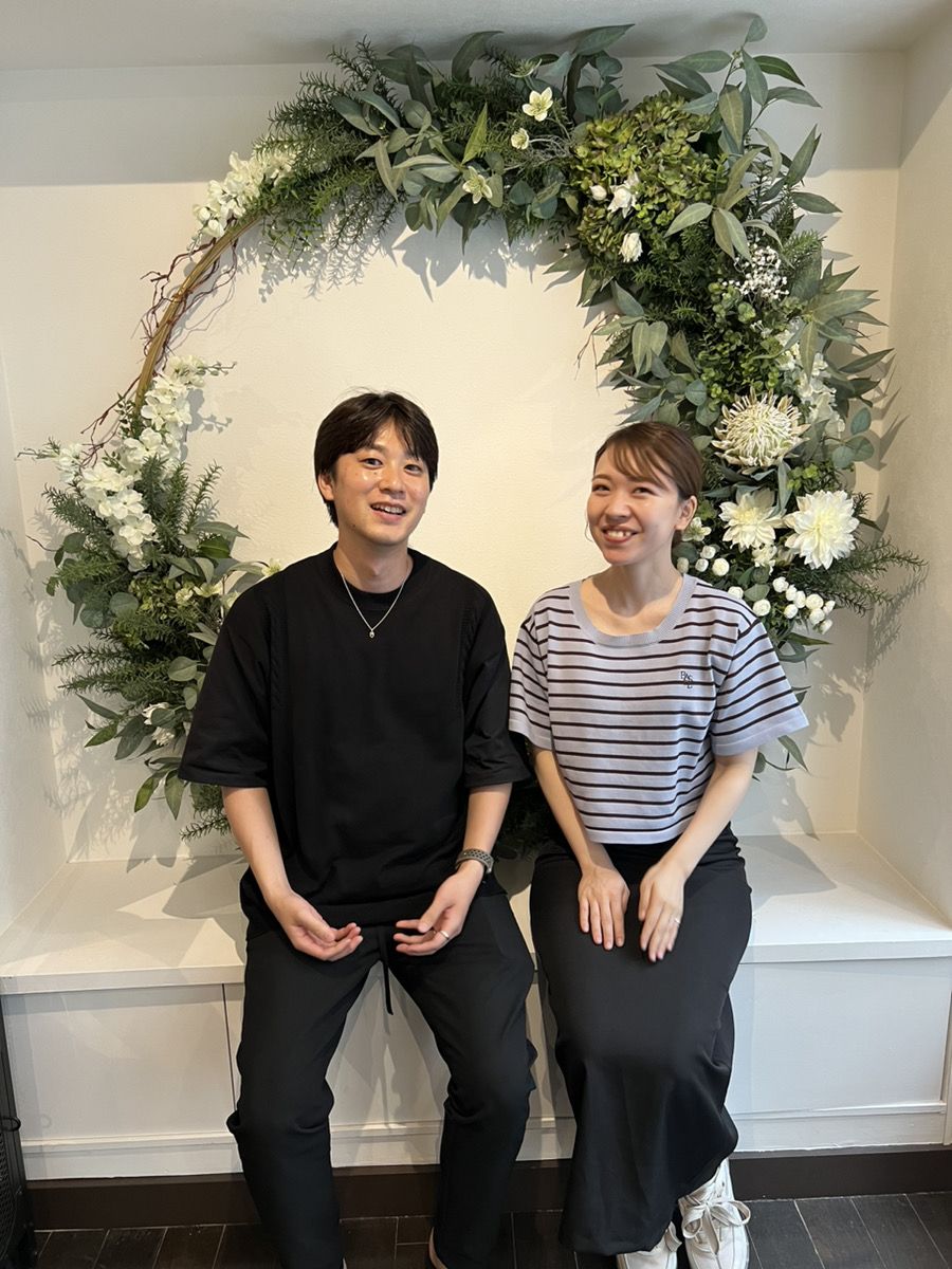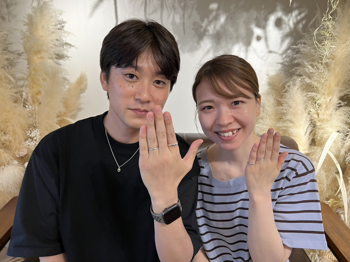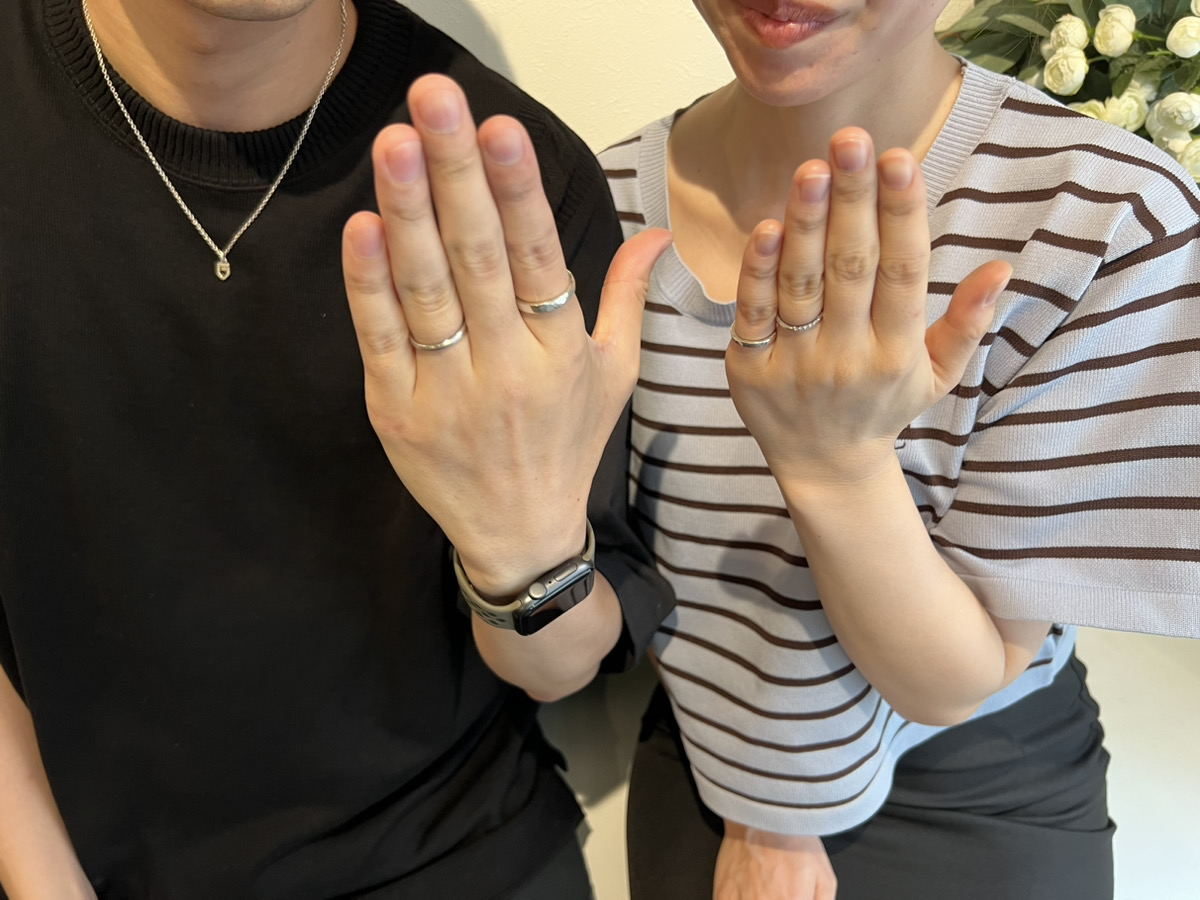 お二人の選んだペアリングデザインはおそろいの平打ちハンマー仕上げリング。