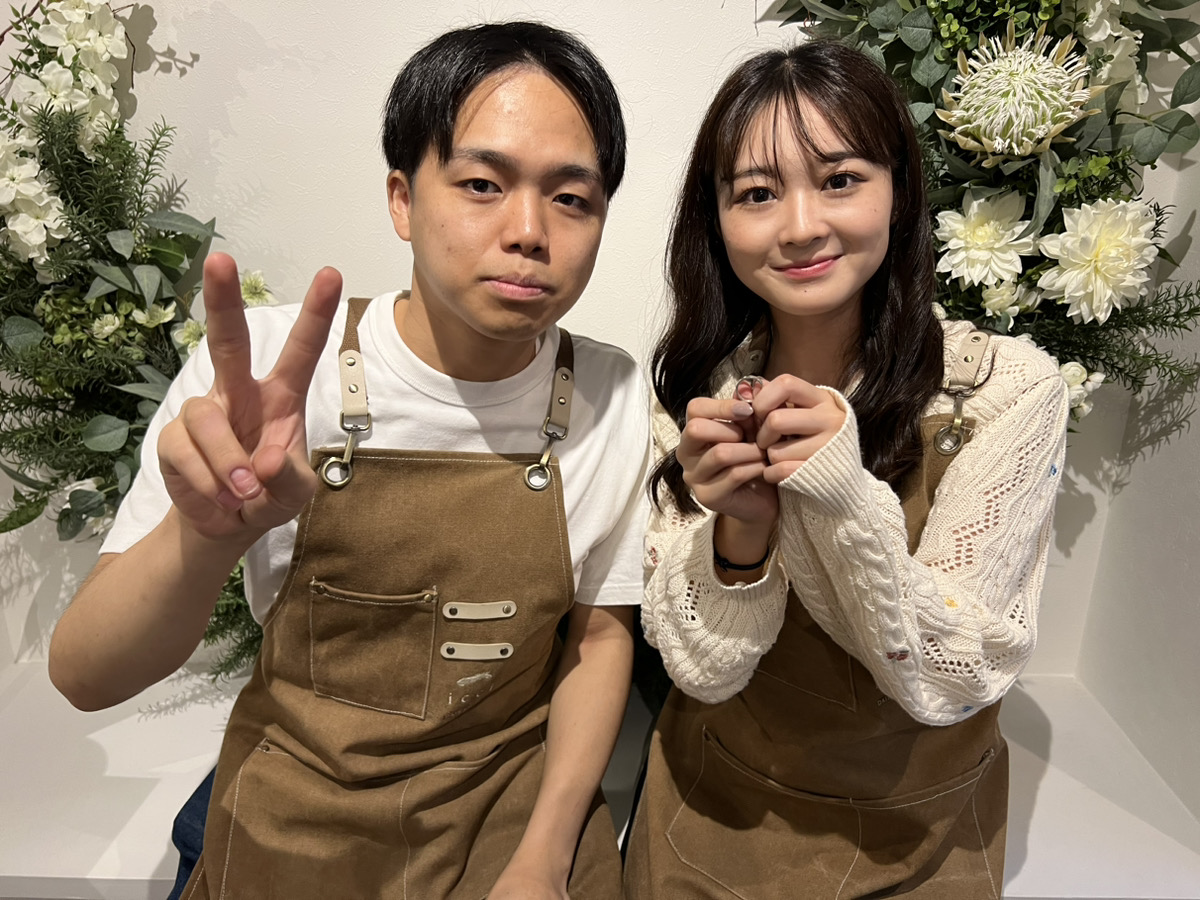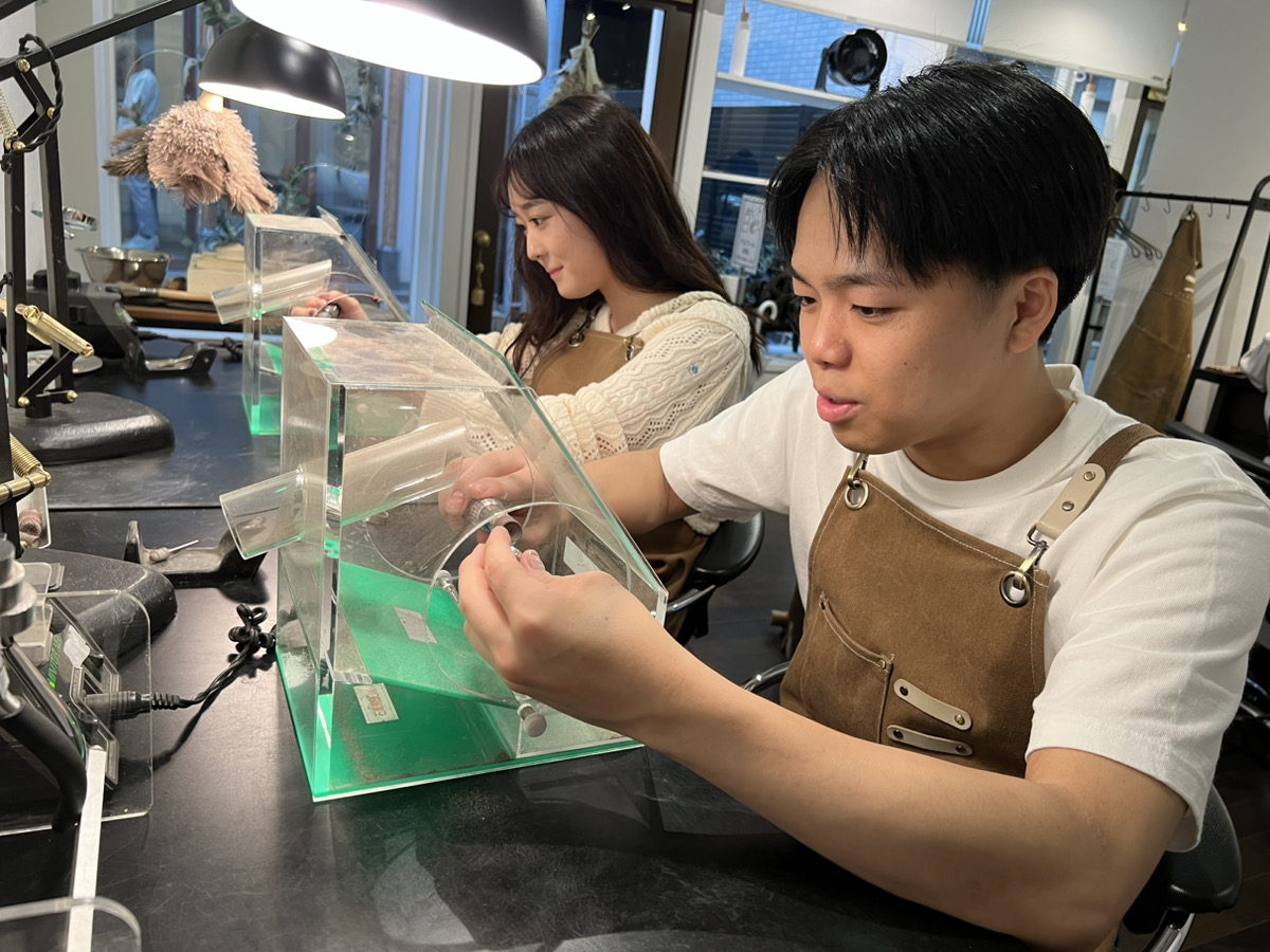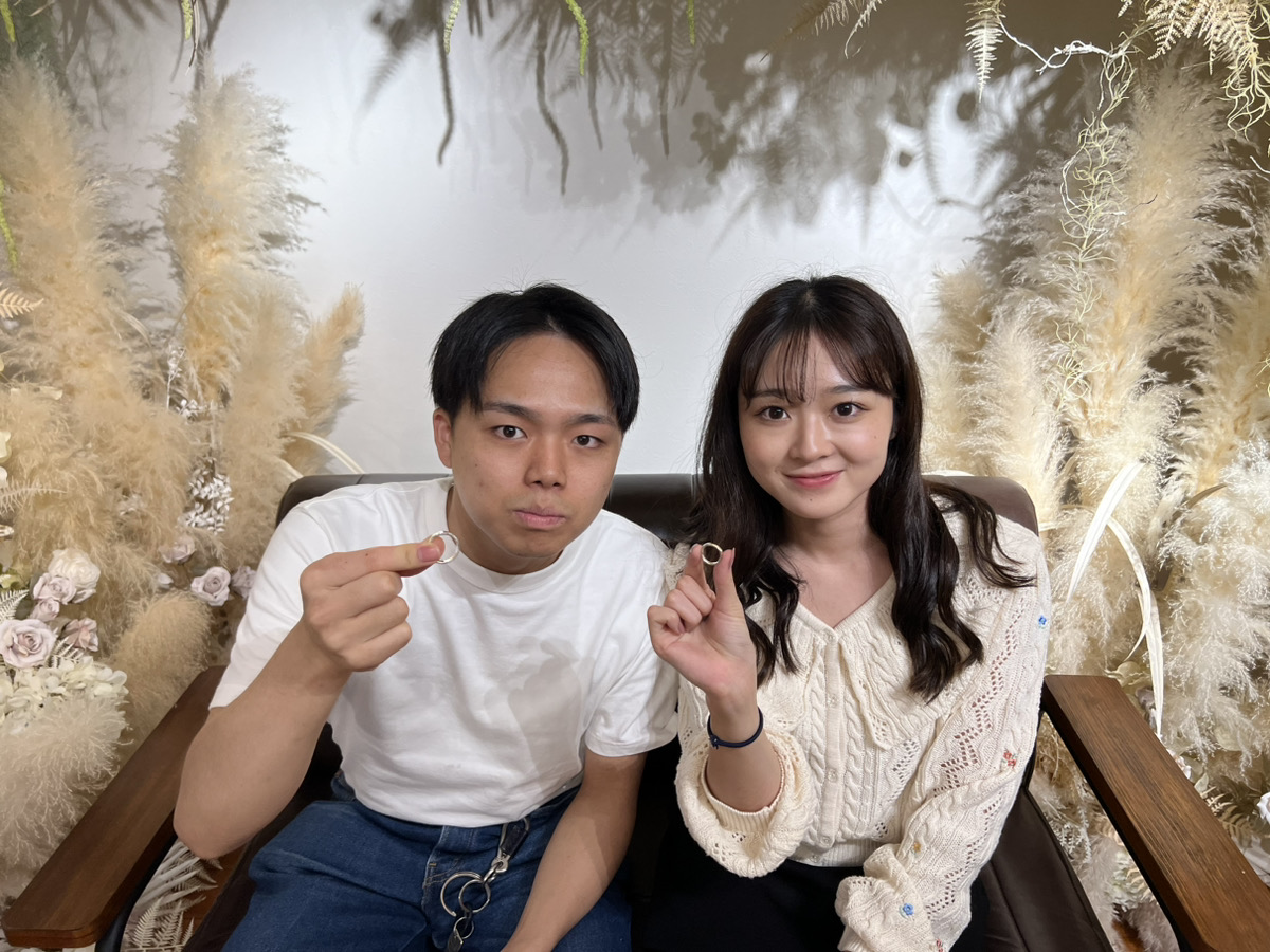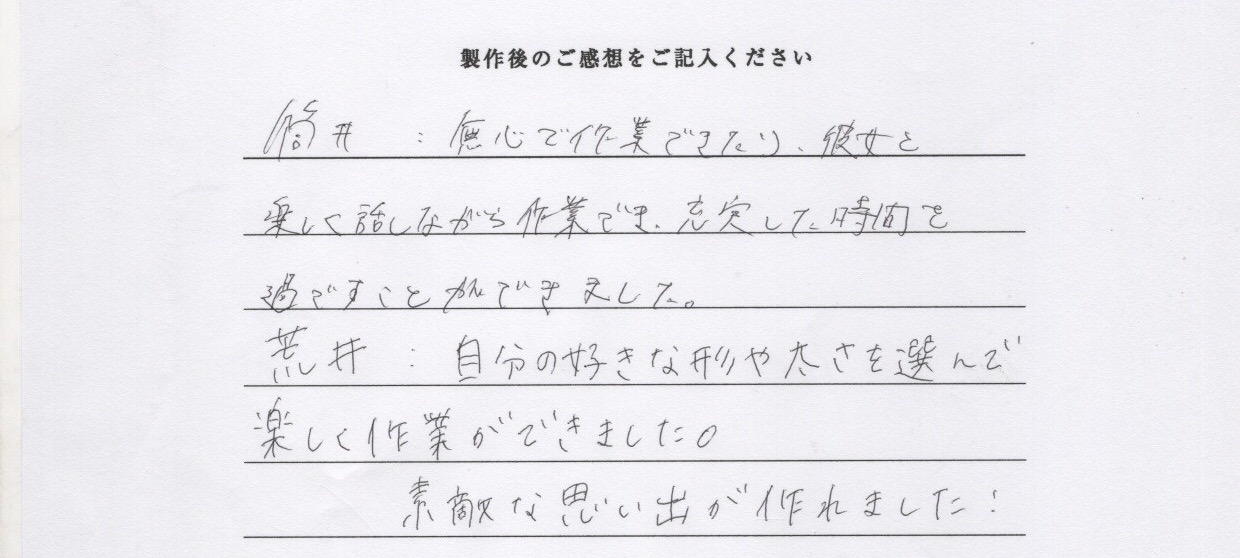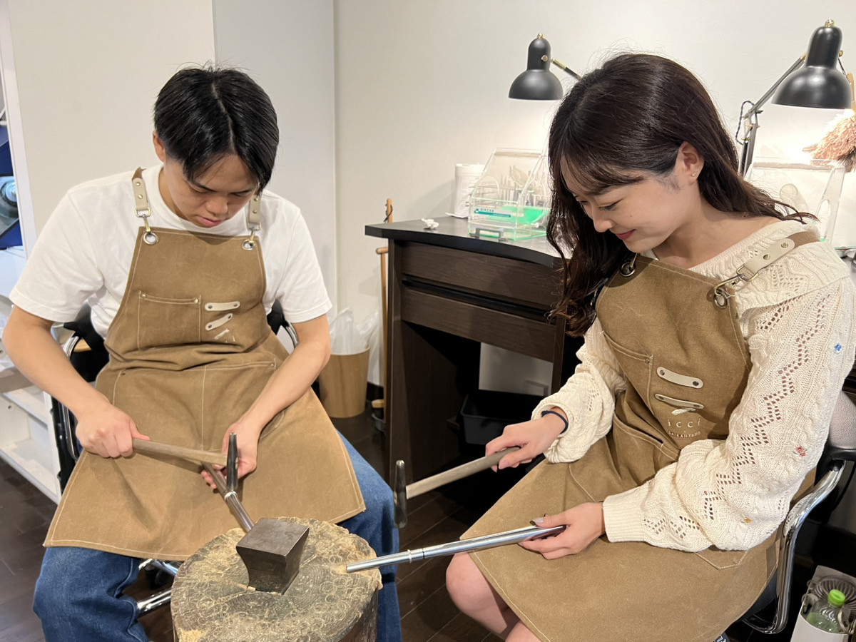 終始楽しそうなお二人は存在感あるハンマー仕上げペアリングを制作。
