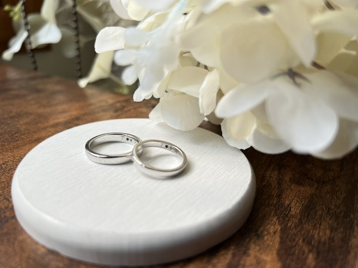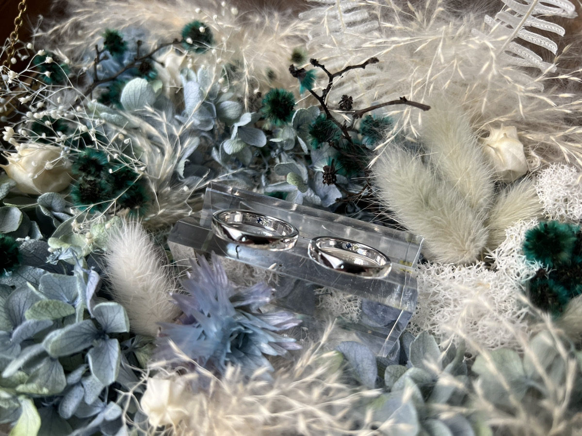 お二人の選んだペアリングデザインはシャープな印象を持つスクエア平打ち鏡面仕上げ。