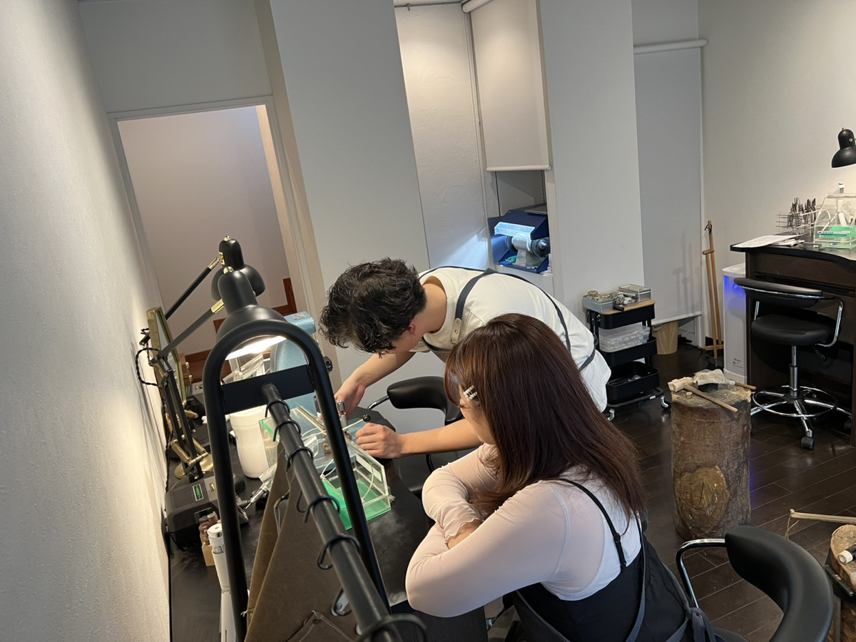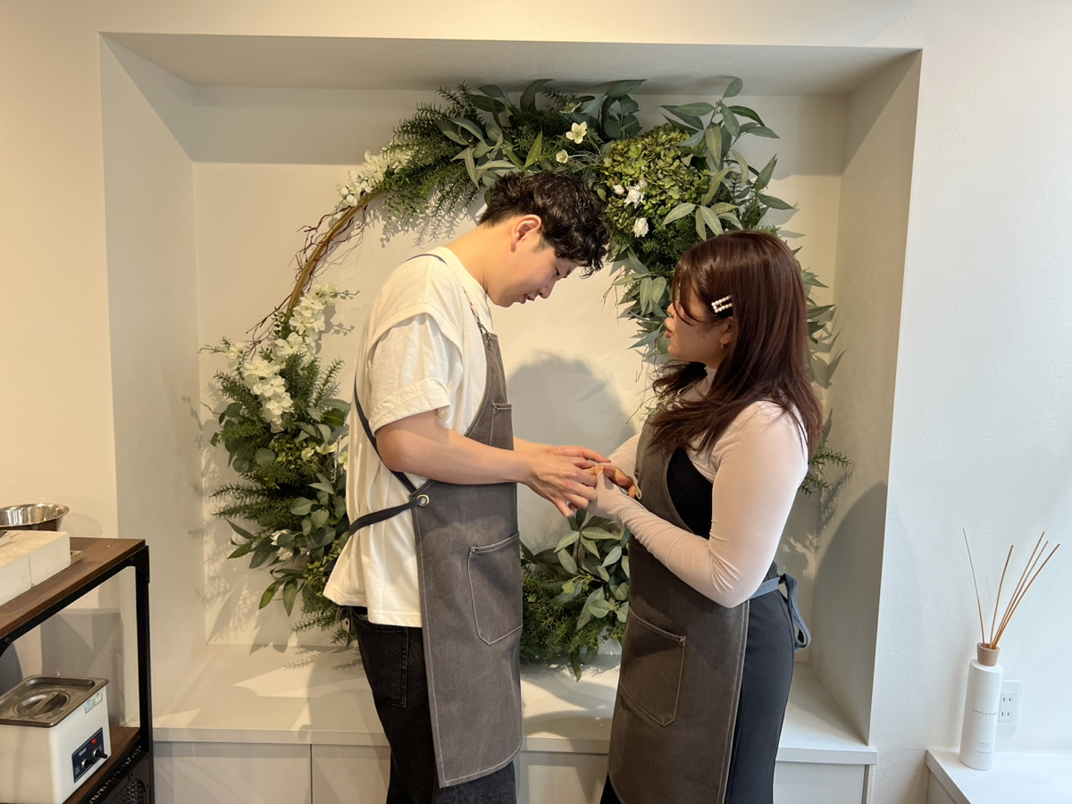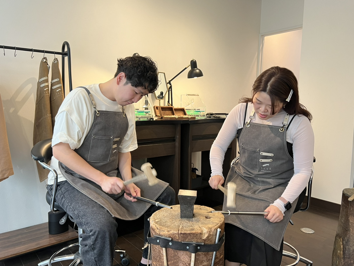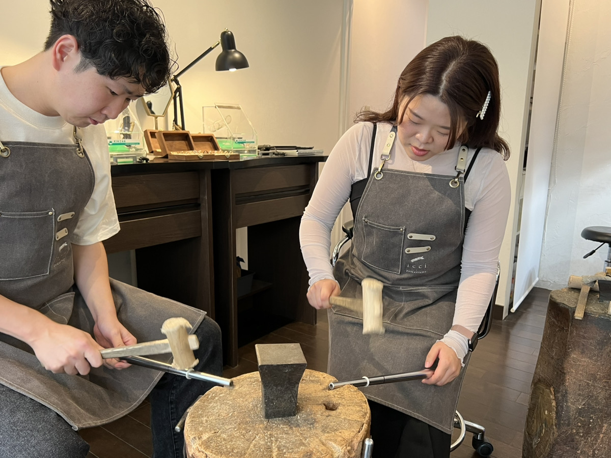 彼女様が留学に行かれる前に記念のリングの制作をされにきたということで、スタッフとしてとても嬉しい場面に立ち会えることができ光栄です。叩く作業が難しいと感じながらもとても楽しそうでした!