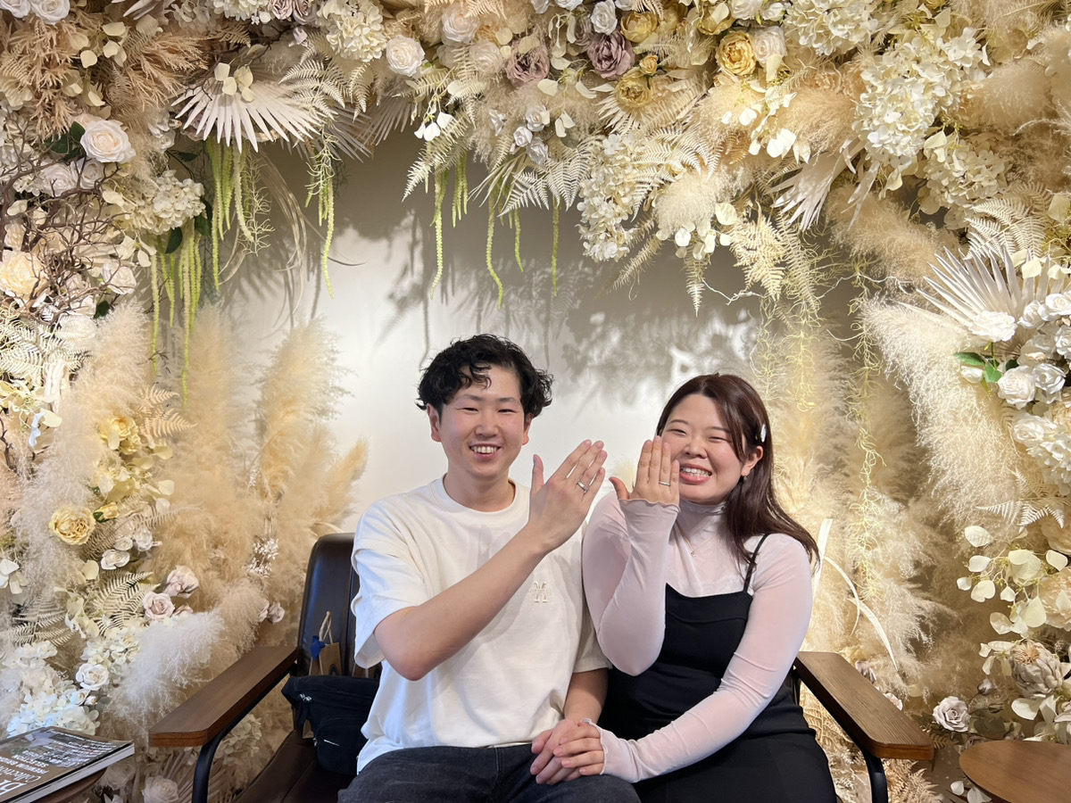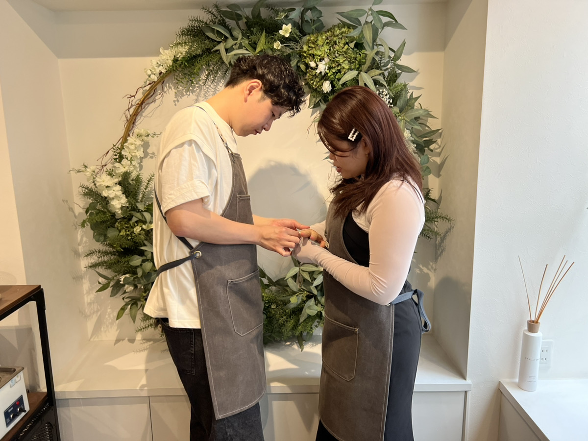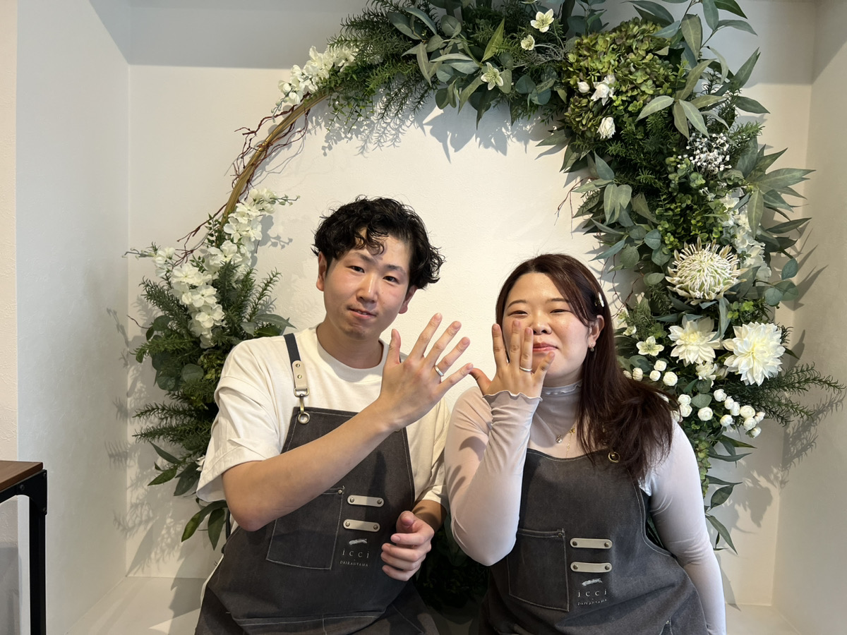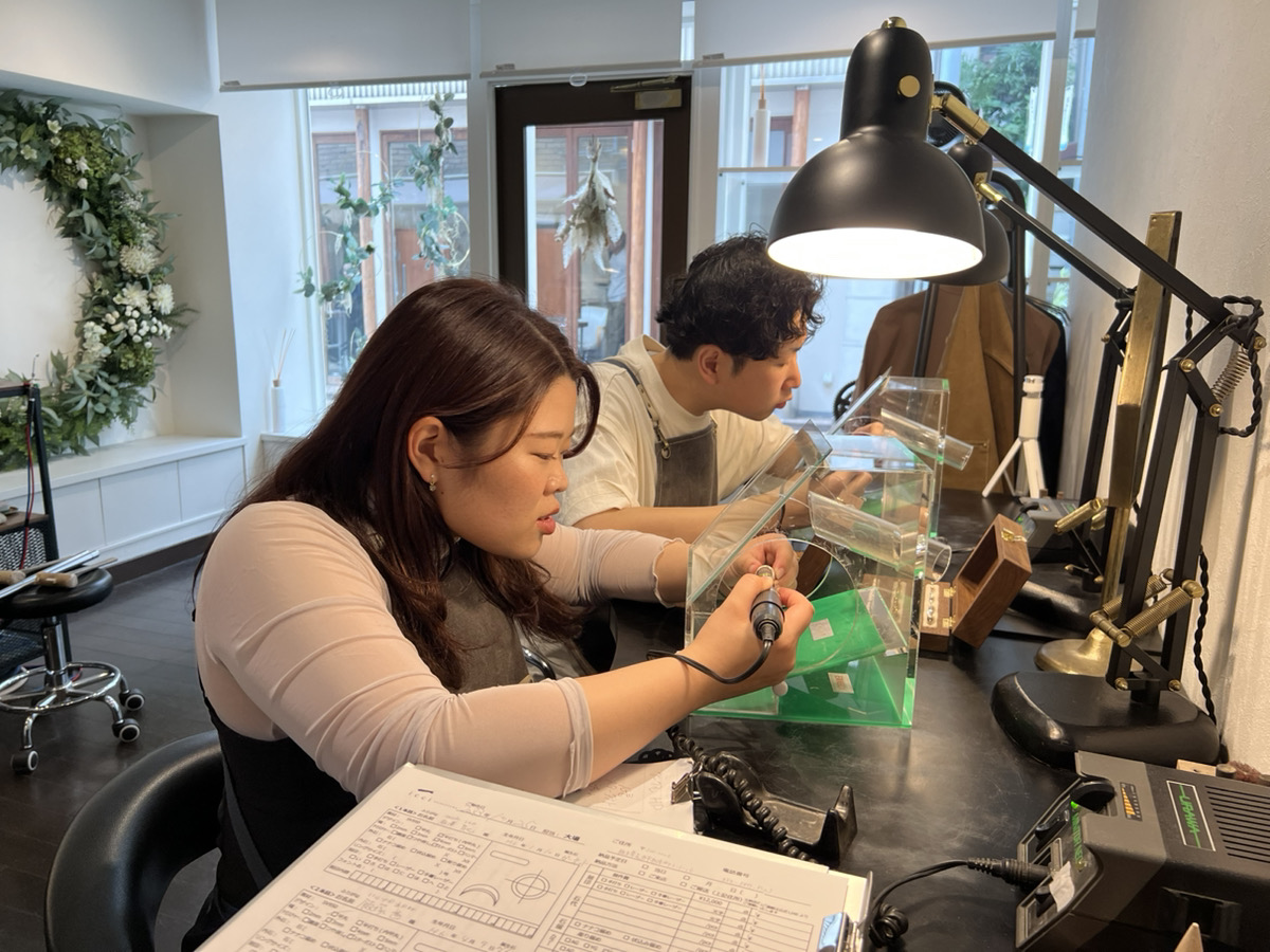 彼女様が留学に行かれる前に記念のリングの制作をされにきたということで、スタッフとしてとても嬉しい場面に立ち会えることができ光栄です。叩く作業が難しいと感じながらもとても楽しそうでした!