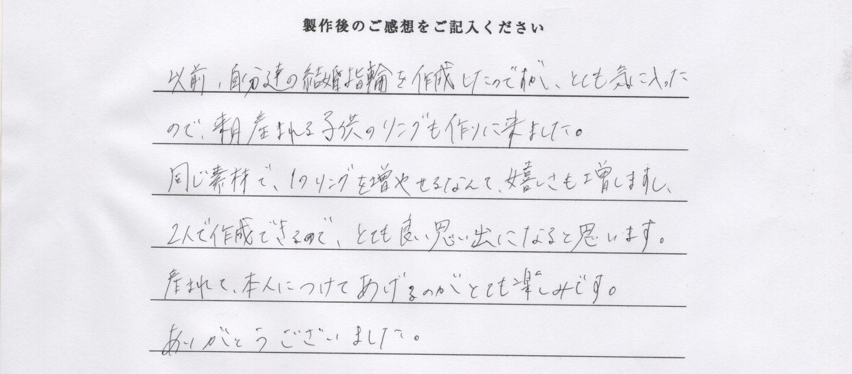 以前自分達の結婚指輪を作成したのですが、とても気に入ったので、来月産まれる子供のリングも作りに来ました。