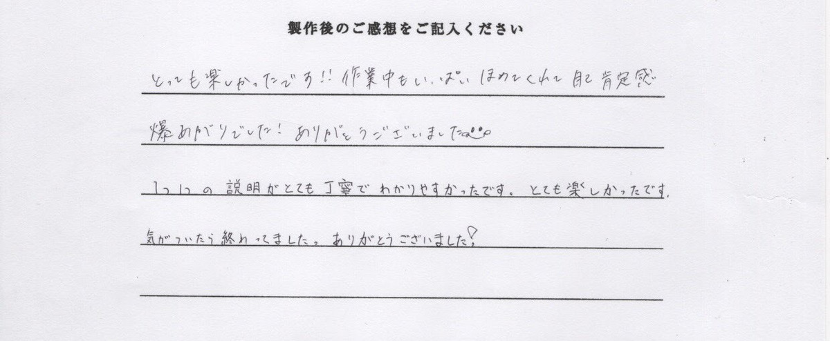 とても楽しかったです!!作業中もいっぱい褒めてくれて自己肯定感爆あがりでした!ありがとうございました。1つ1つの説明がとても丁寧で分かりやすかったです。とても楽しかったです。ありがとうございました!